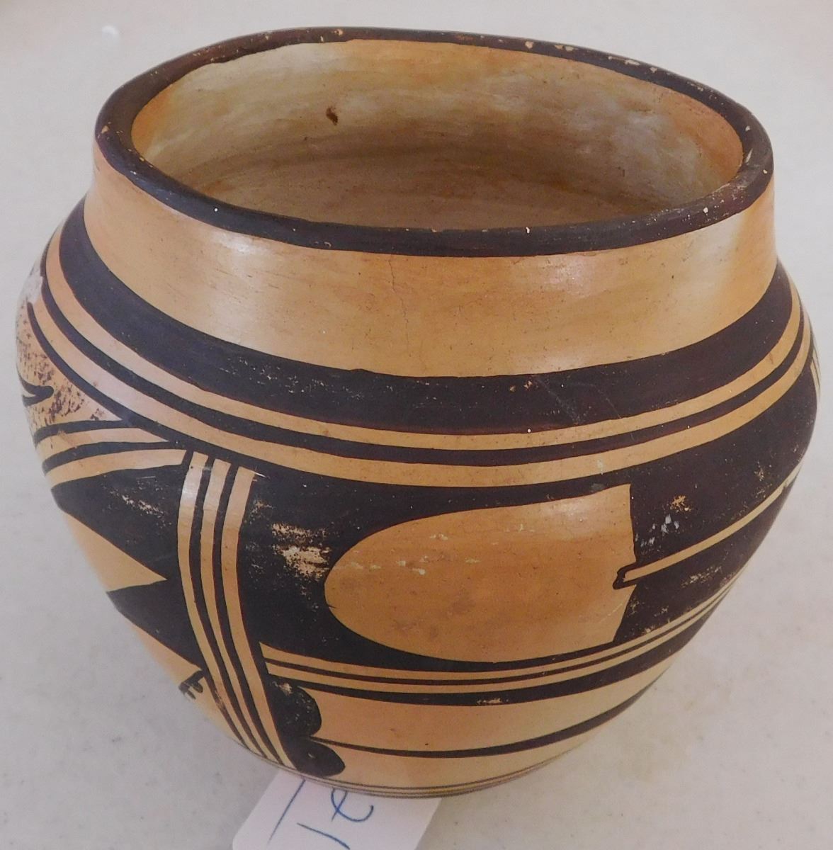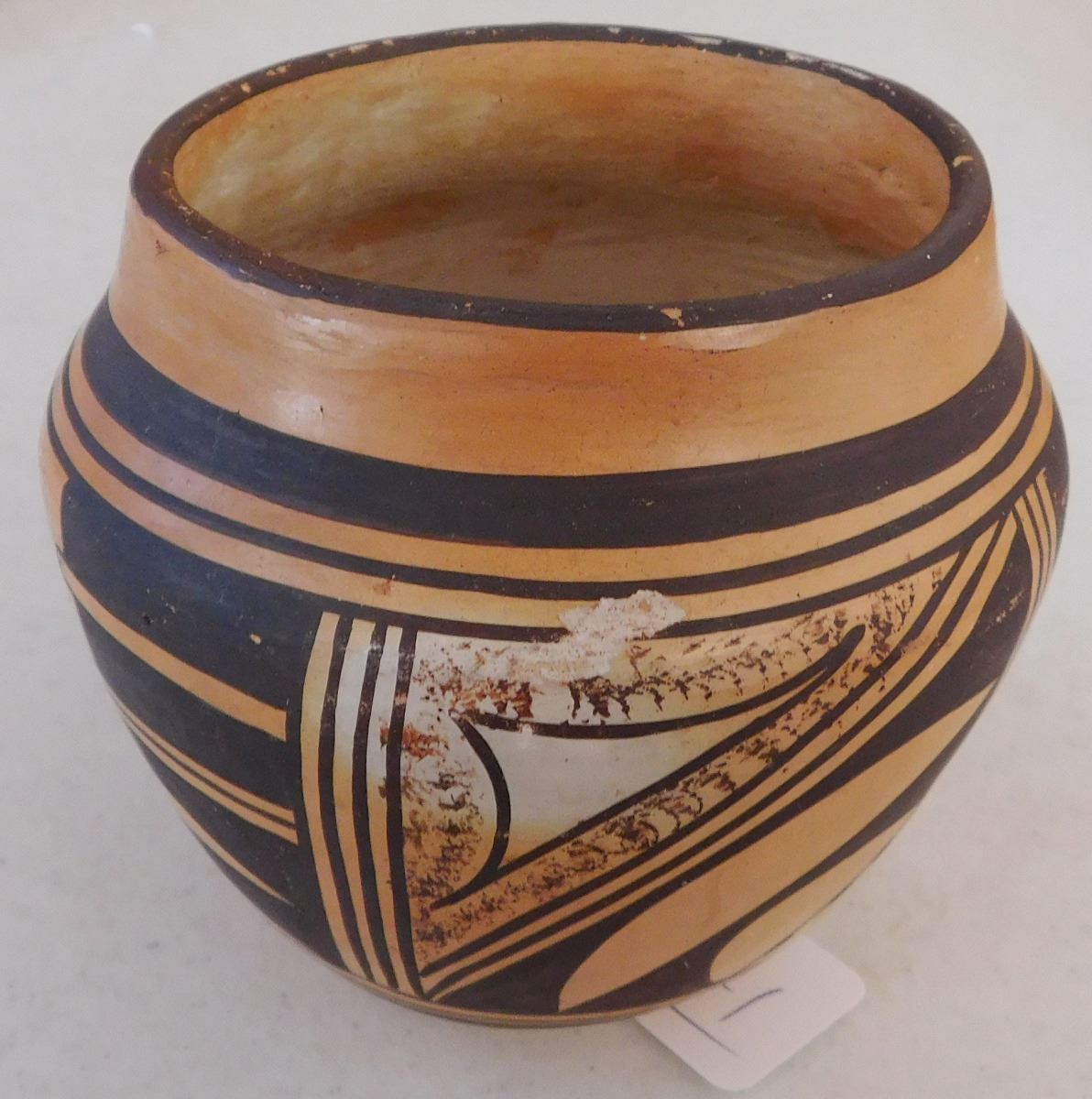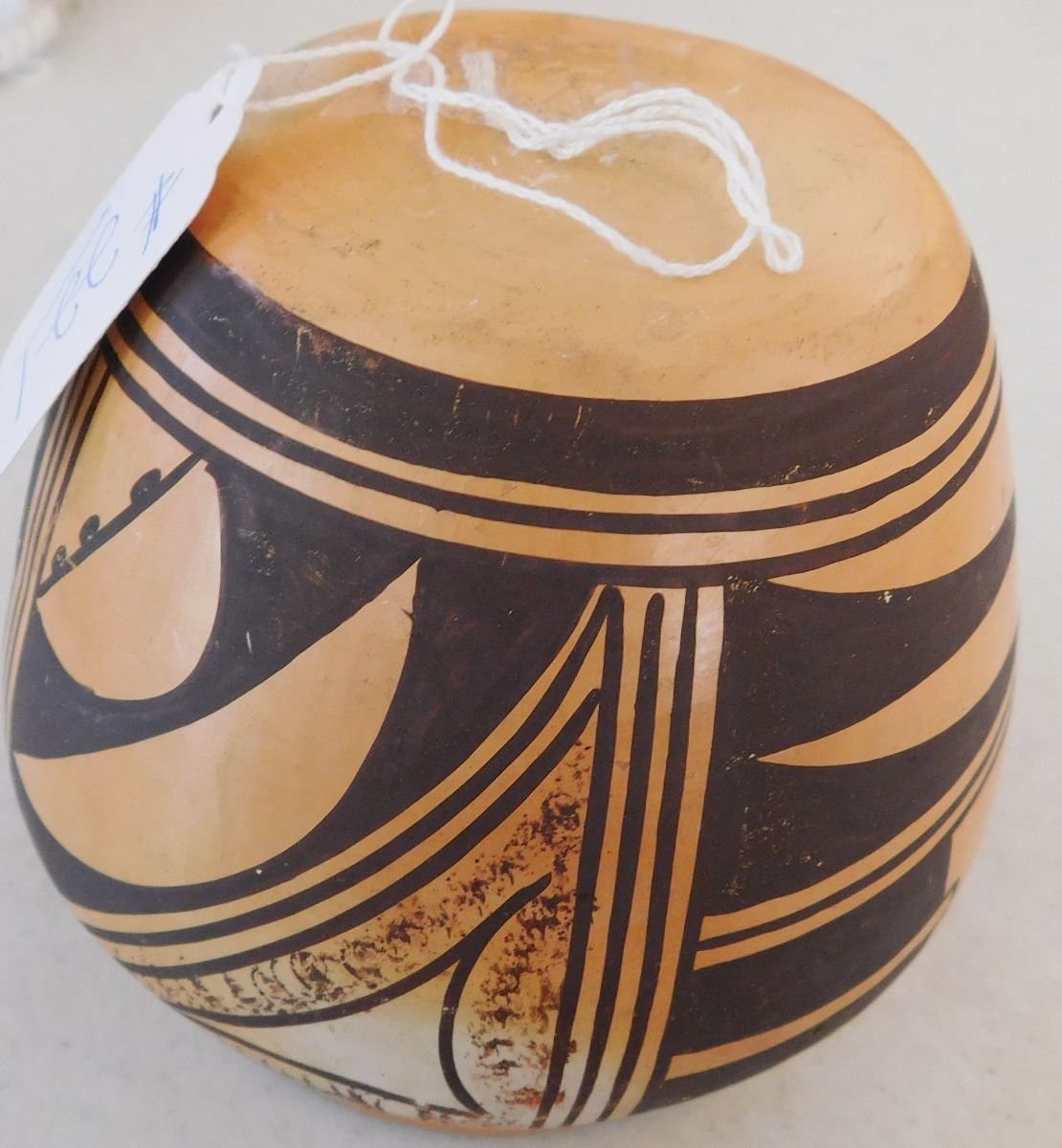 Hopi Pottery Olla, circa 1930s. Made of clay and paint, this item measures 4.5" x 4.5". From northern-central Arizona. Condition: Tiny scratches, see images. Shipping: $25.50, requires double box.
