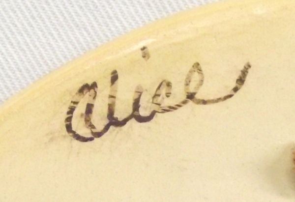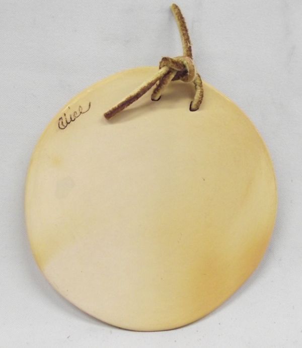Native American Hopi Pottery Plaque by Alice Dashee, etched on the front of plaque is the head of the long-haired kachina and 6 crosses, there is a leather loop for hanging, it is signed on back ''Alice'', measures approx. 4.25''D.