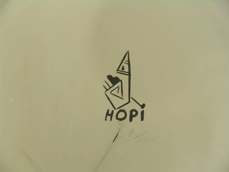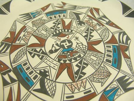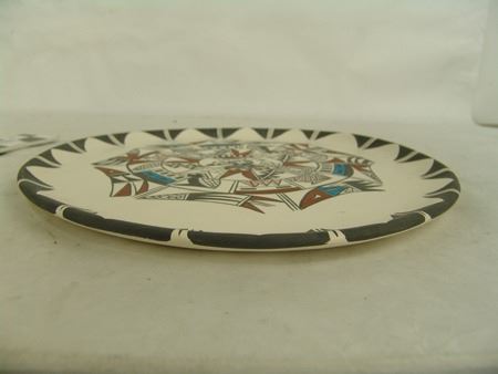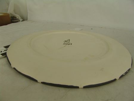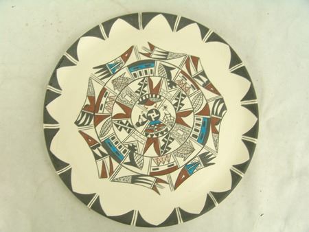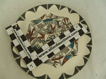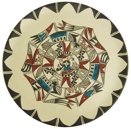 Early 2000s, Elaborately painted green ware plate with both traditional and contemporary elements. Good condition, minor scuffs. With unknown hallmark. 13"
