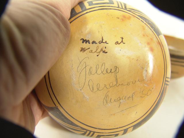 Circa 1950s, Garnet Pavatea, Redware plate in rare shape with traditional black Hopi design on exterior. 2" x 8-3/4"