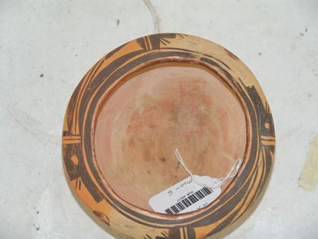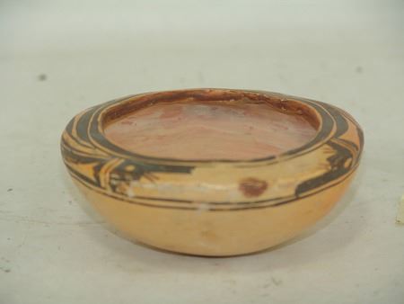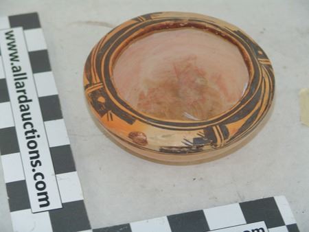 Early 1900s, Very early traditional black-on-yellow bowl with incurved shoulder and traditional avian inspired motif. Fair condition, shows much use, and has some scratches and dings. 2" x 5-1/2"