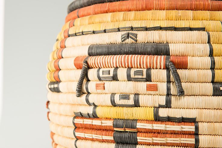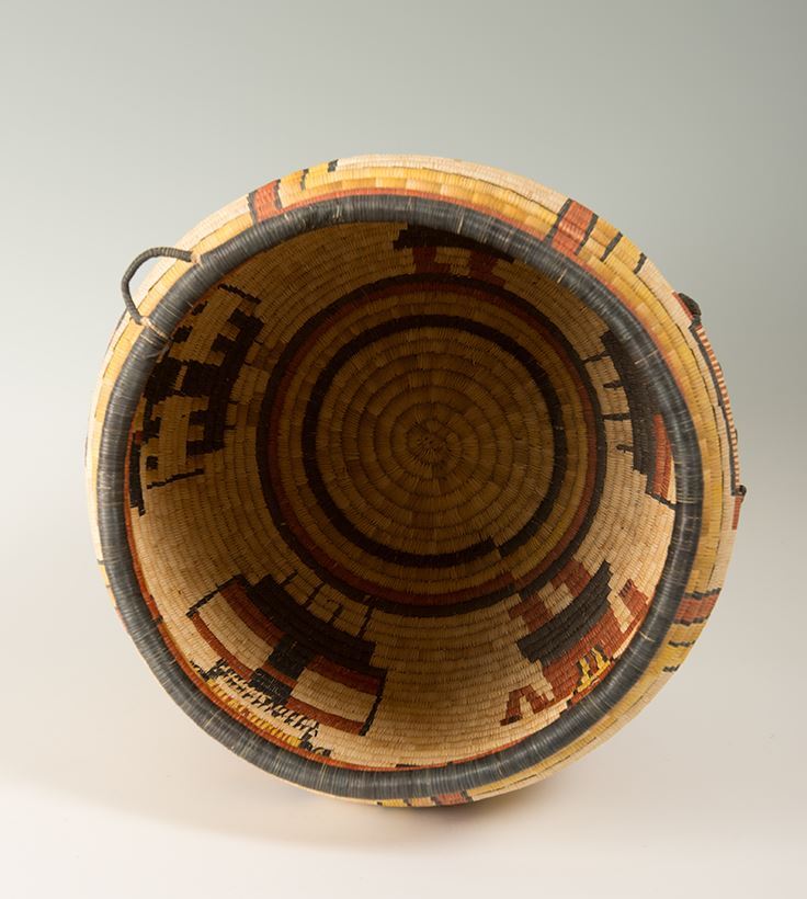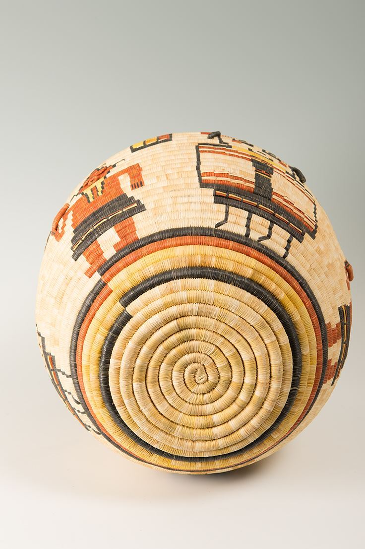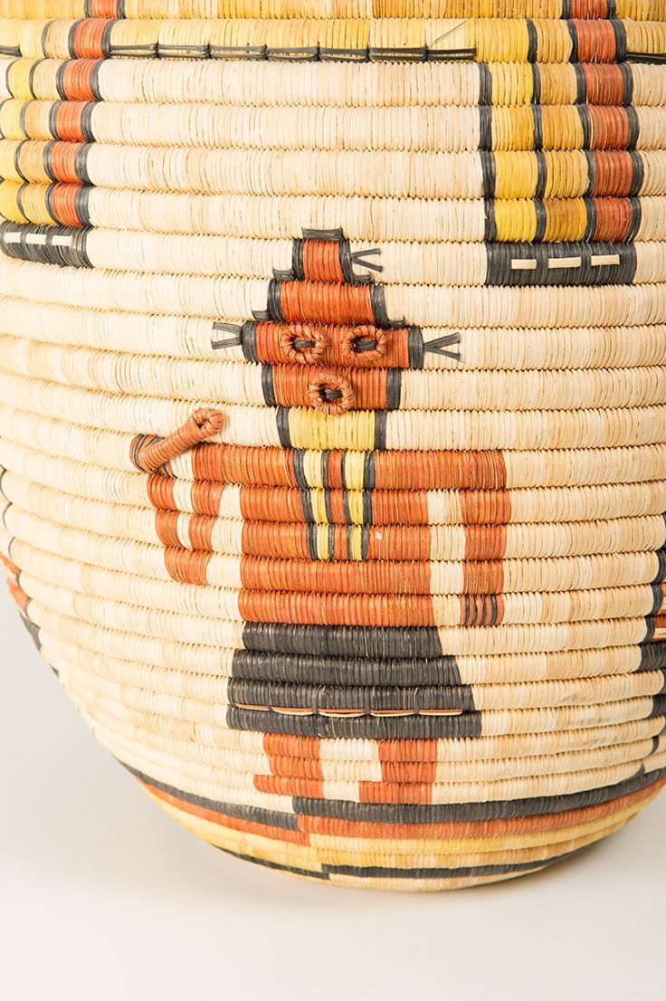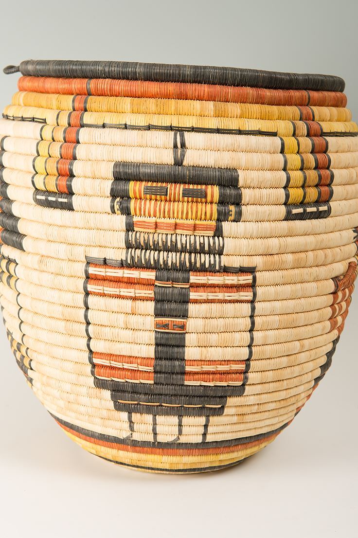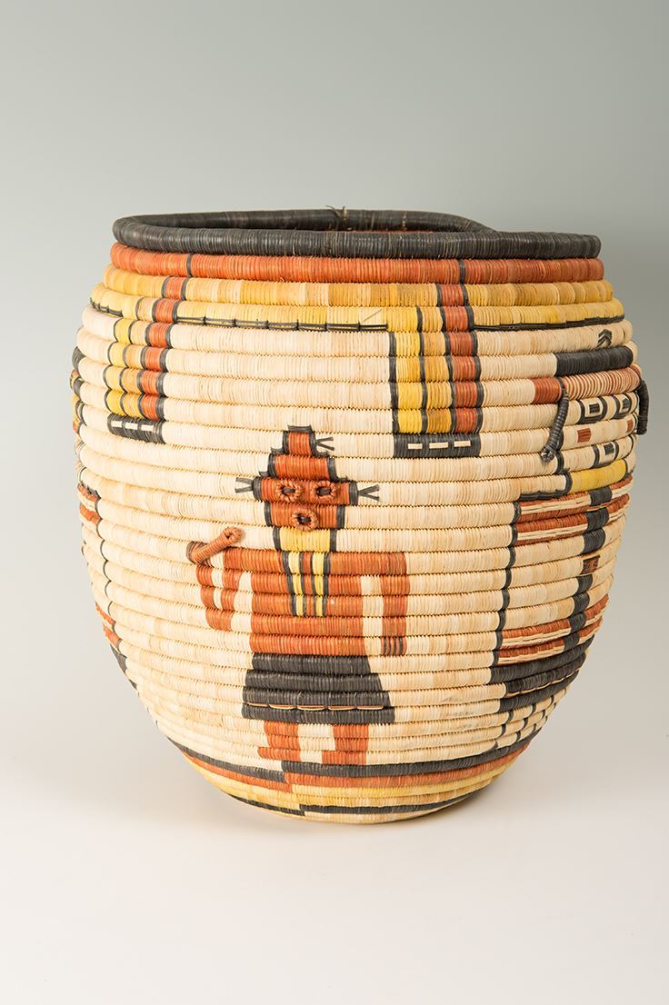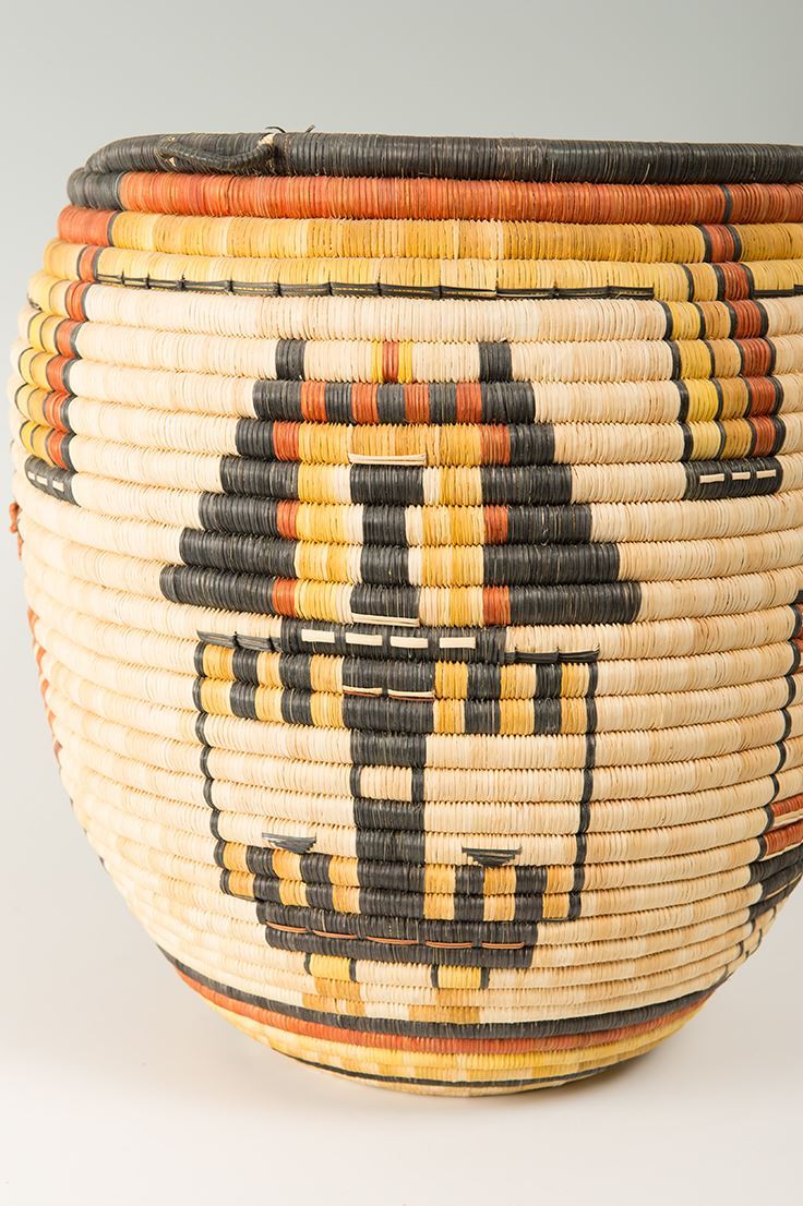 Hopi Pueblo Storage Basket. 15 ¼" x 15 ¼" basket with large Kachina figures weaved in different colors. An extraordinary basket. Circa 1970's.