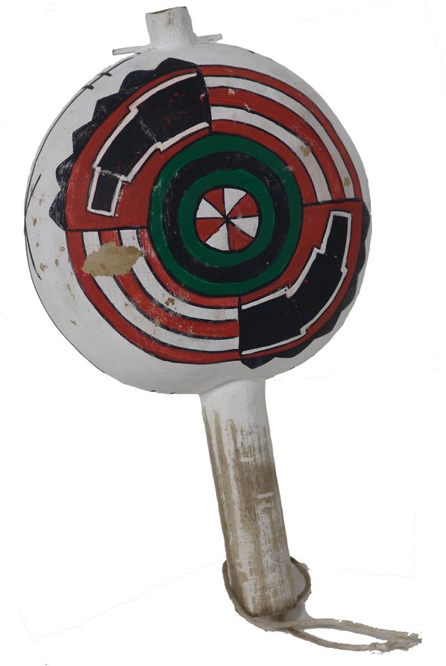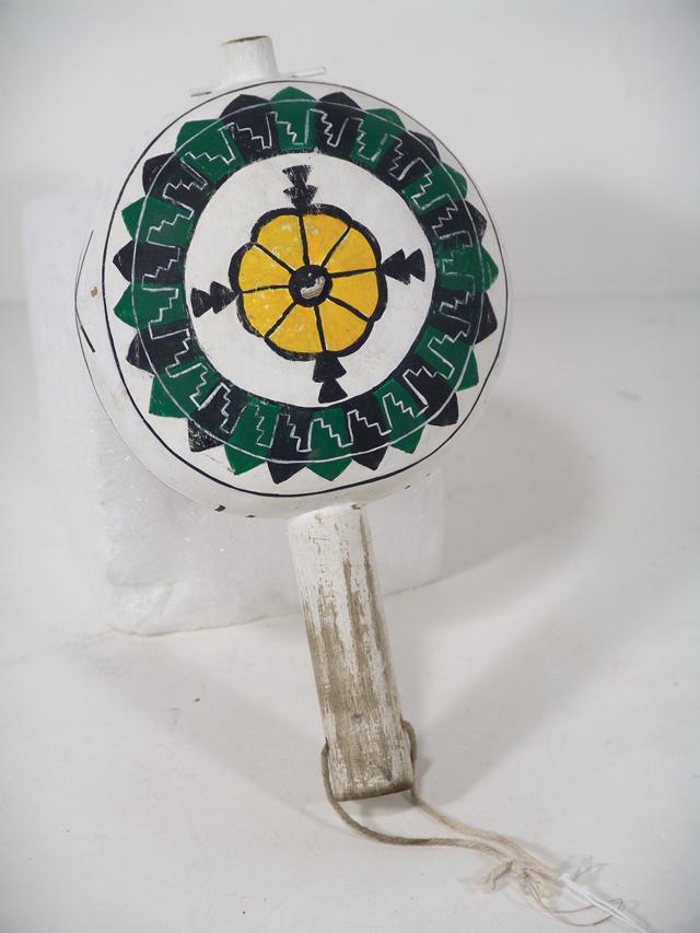 Circa 1940, Fine, old, hand painted gourd dance rattle with fine detail. 10-1/2" x 6"