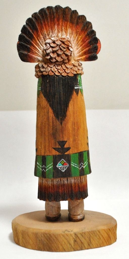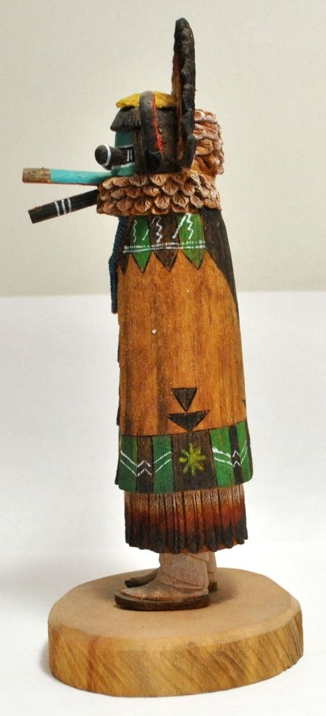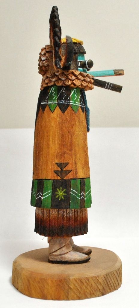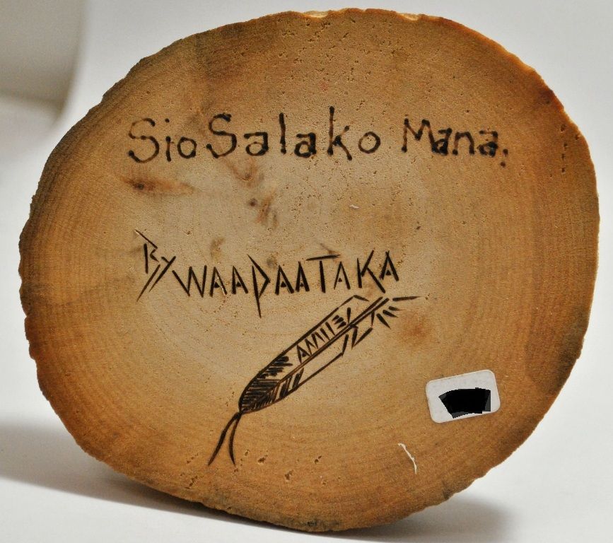 Measures 8" tall by 4-1/4" wide by 4-1/4" deep. Figure is "Sio Salaka Mana" carved by Hopi artist Waapaataka Amilestewa. One of a kind, the entire piece is carved from a single piece of cottonwood.