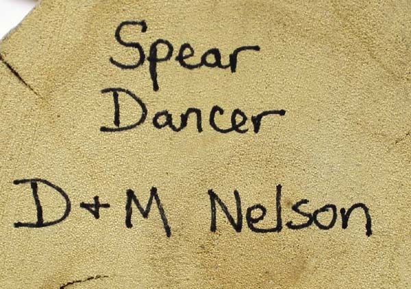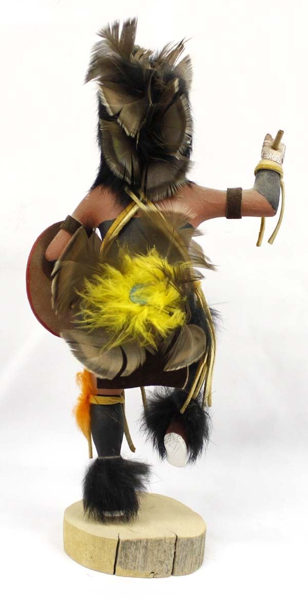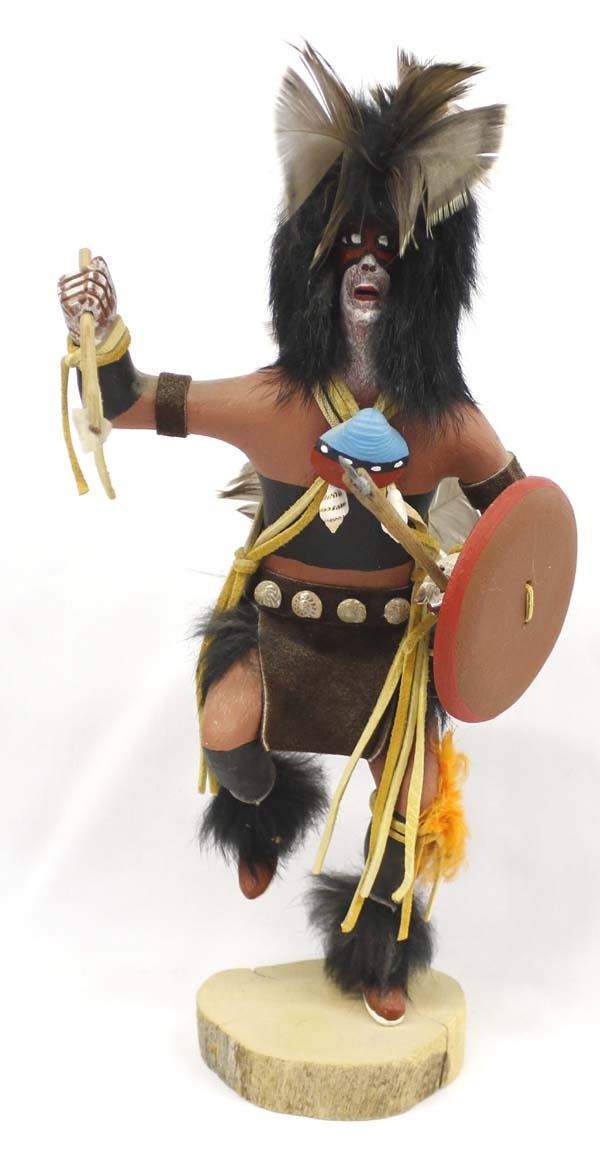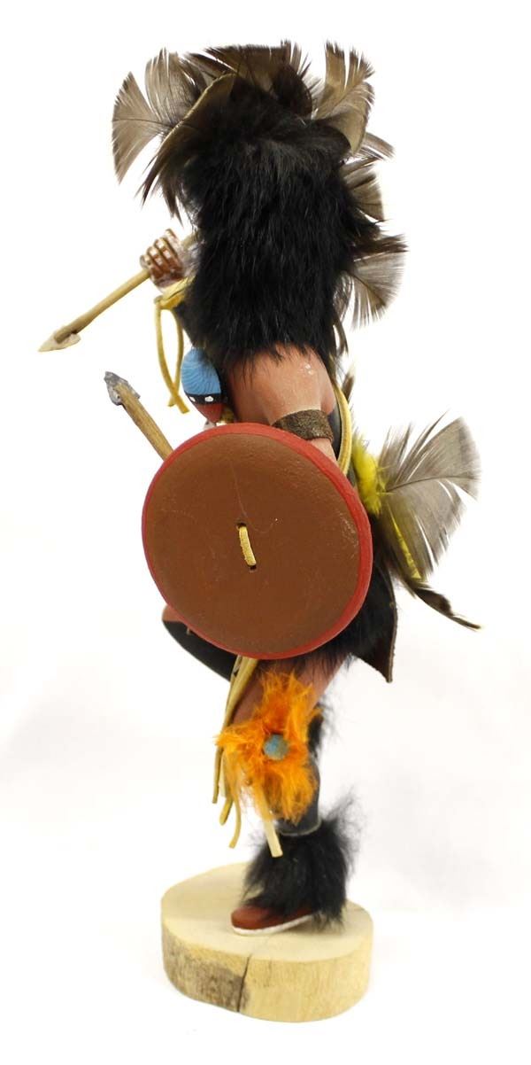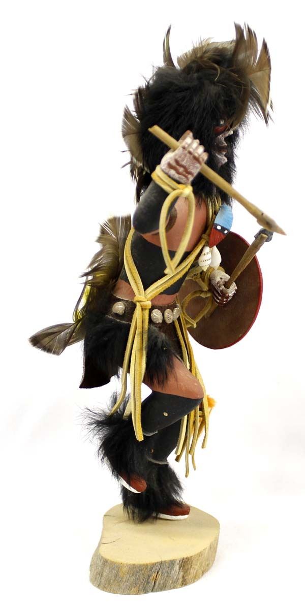 Massey Estate: Native American Hopi Spear Dancer Kachina by D & M Nelson, measures 11.5''H x 5''W x 6''Deep and signed by the artists, embellished with rabbit fur, feathers, leather, and shells