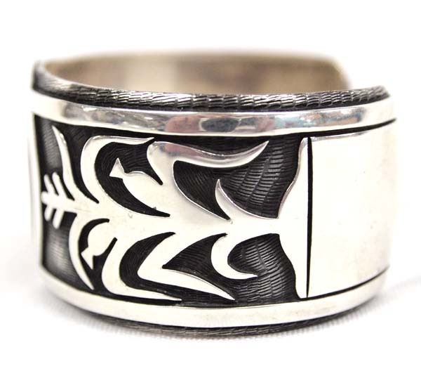 Phenomenal Native American Hopi Sterling Silver Man in the Maze Cuff Bracelet by Bradley Gashwazra, hallmarked BG and also hallmarked for Kopavi Shop, inside measures 7'' which includes opening x 1.25''W, 74.11g in total wt.