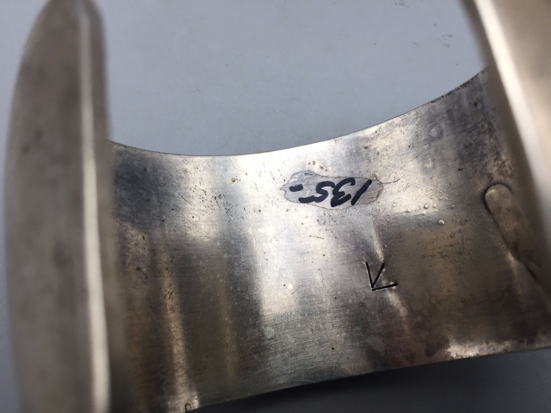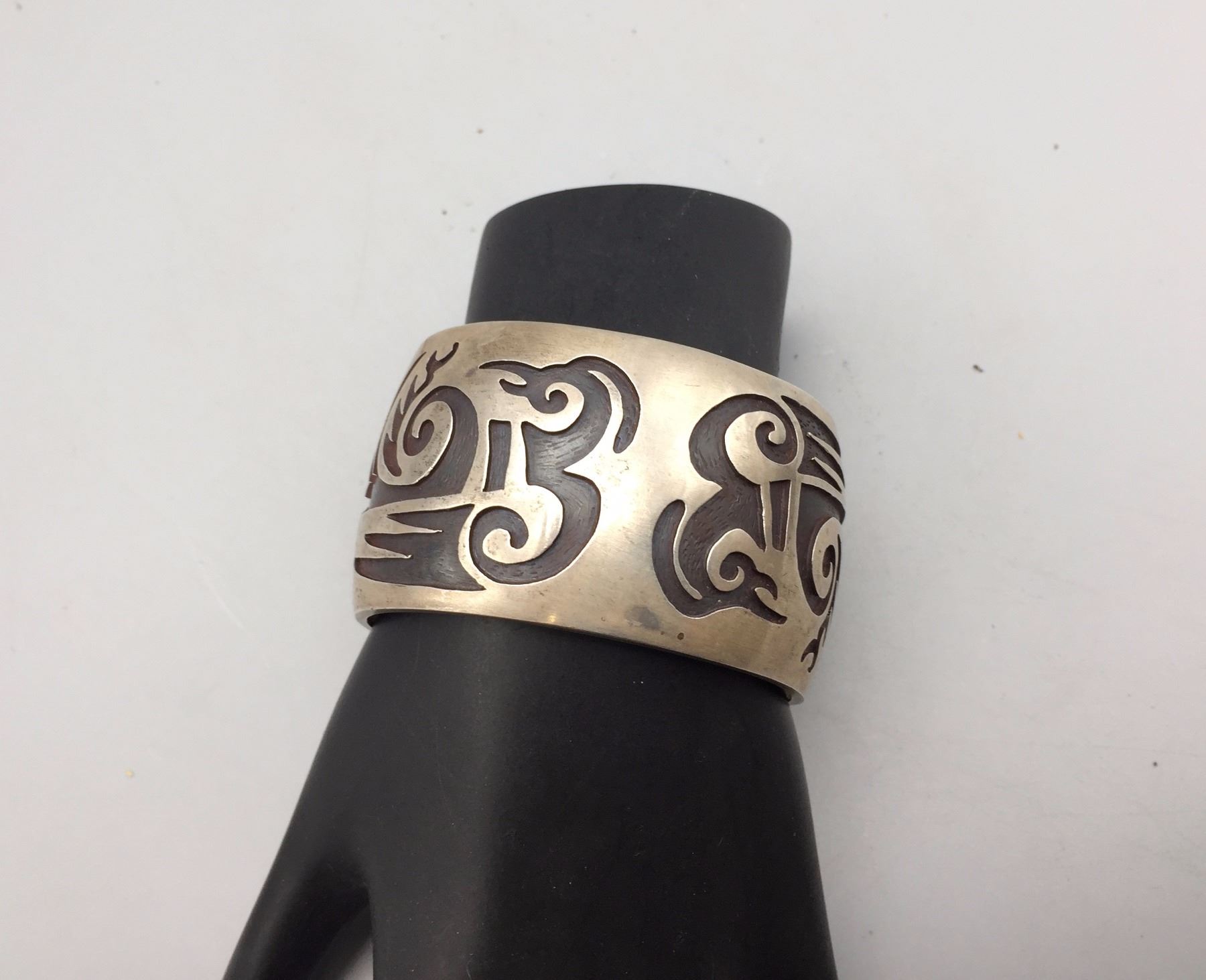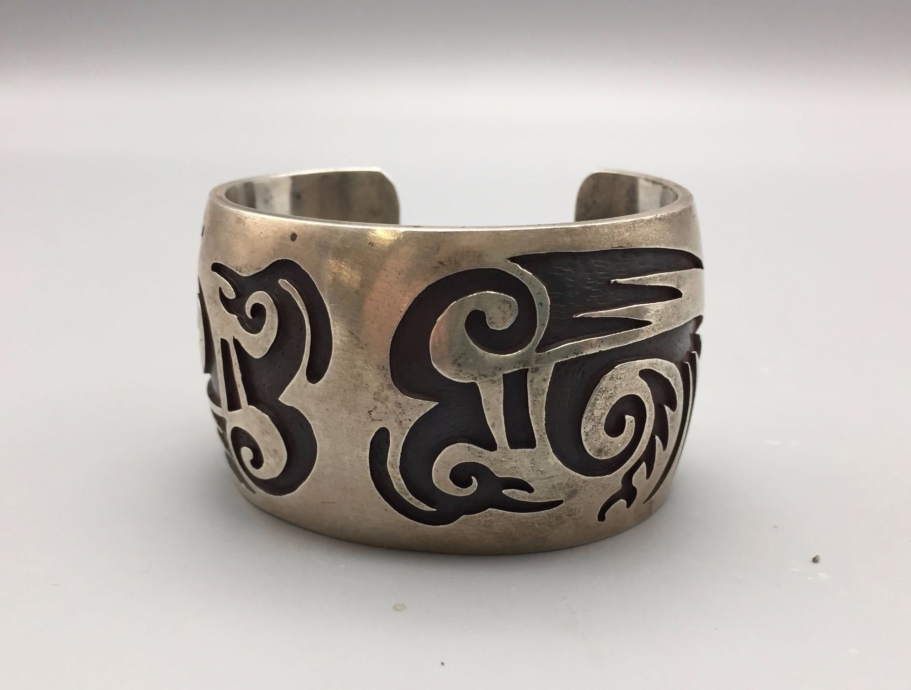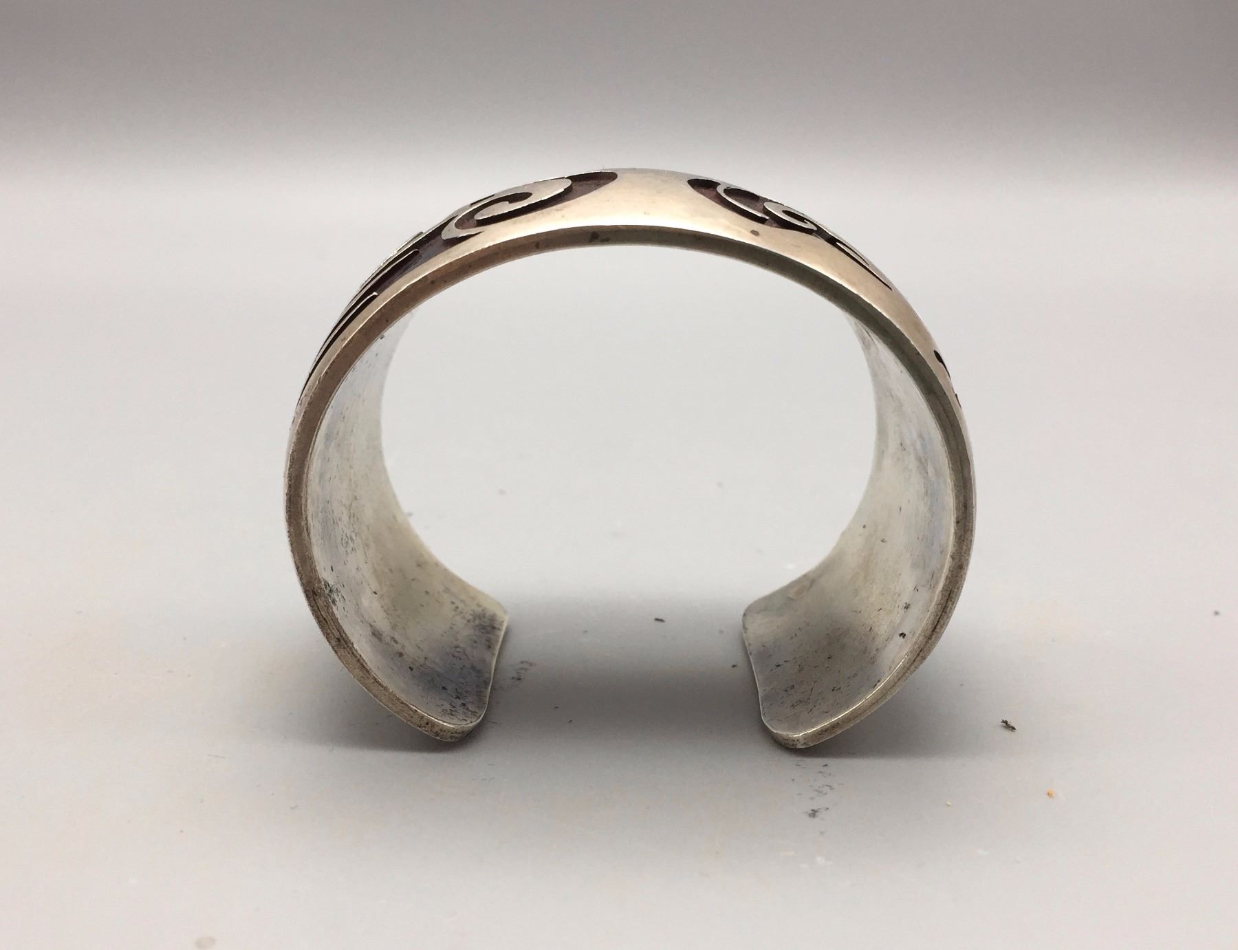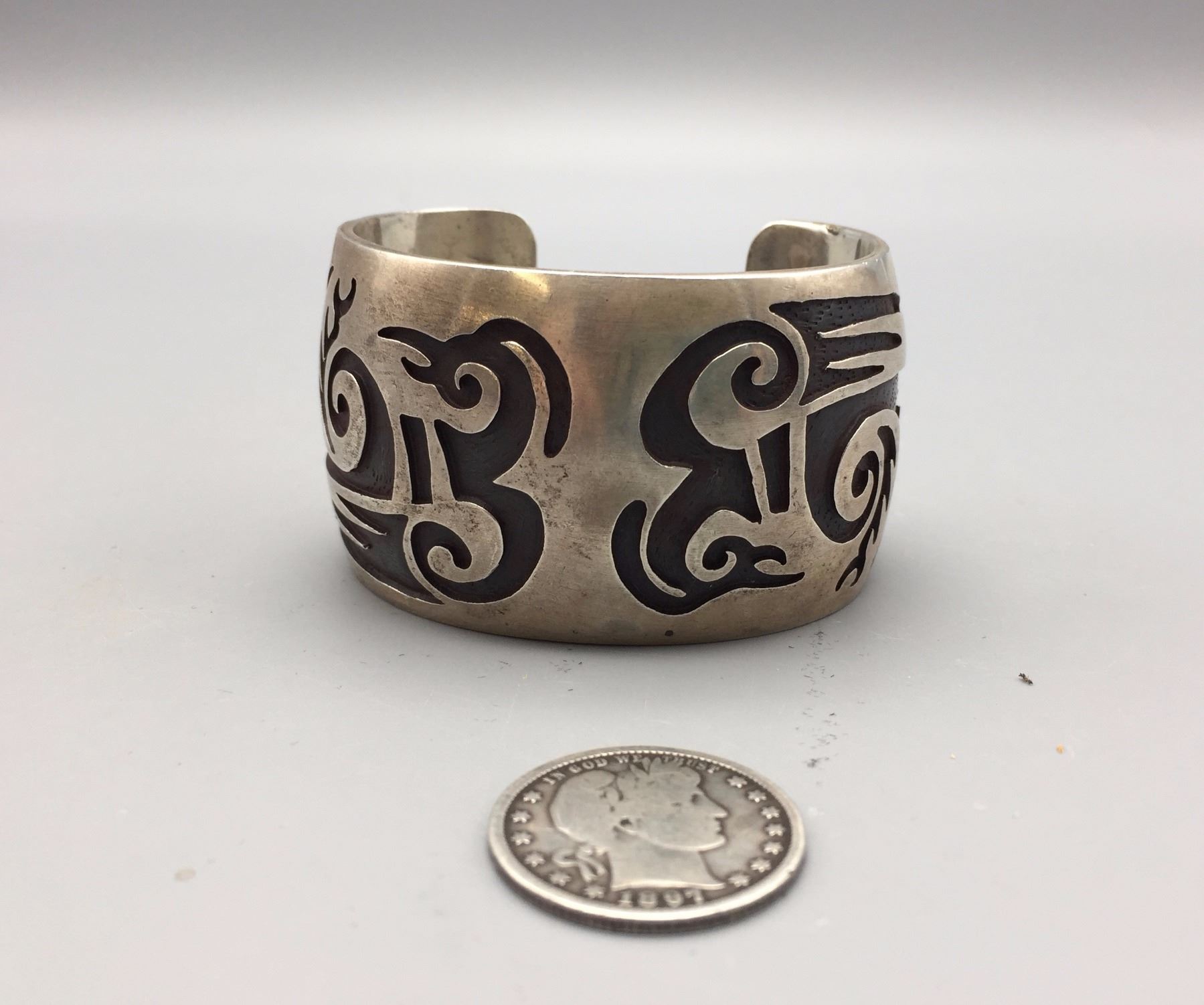 Maker: Unable to identify maker’s hallmark, appears to be a vintage Hopi item. Approx. Age: Vintage, circa 1970s. Size: Inside circumference 5 1/2” with an additional 1 1/8” opening (fits a 6 5/8” wrist) and is approx. 1 1/4” wide. Weighs 91.2 g. Additional Info: Sterling silver overlay bracelet with Hopi designs. Condition: Good for it’s age, normal wear expected. Please look closely at the pictures - they are an important part of our description. Shipping: There will be a $5 handling / packaging fee for shipping this lot. The actual cost of postage will be added on top of that.