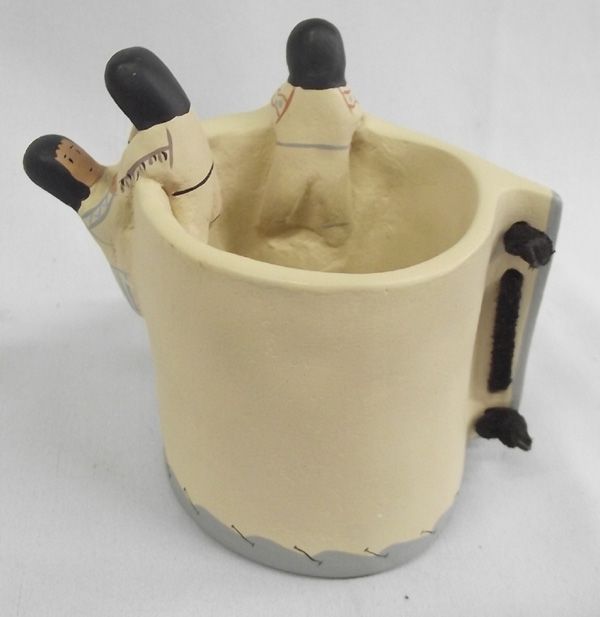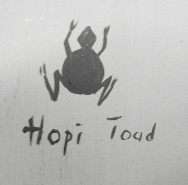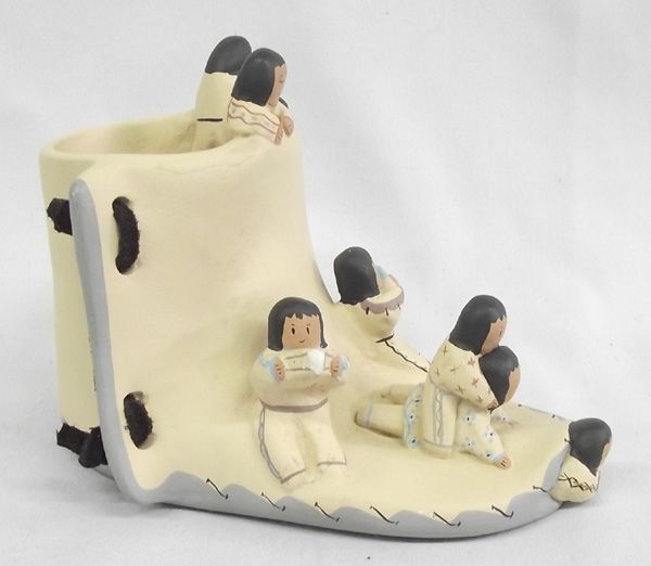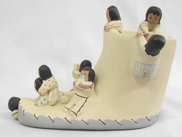 Hopi Storyteller Pottery Moccasin Figure. Unusual and clever storyteller style figure - children crawling on a moccasin insted of the woman. Signed on the bottom with the artist's hallmark, a toad figure and ''Hopi Toad.'' It measures 4''H x 6''L x 4.5''W.