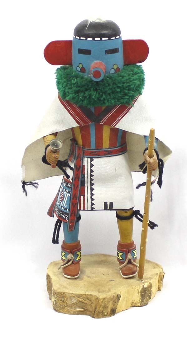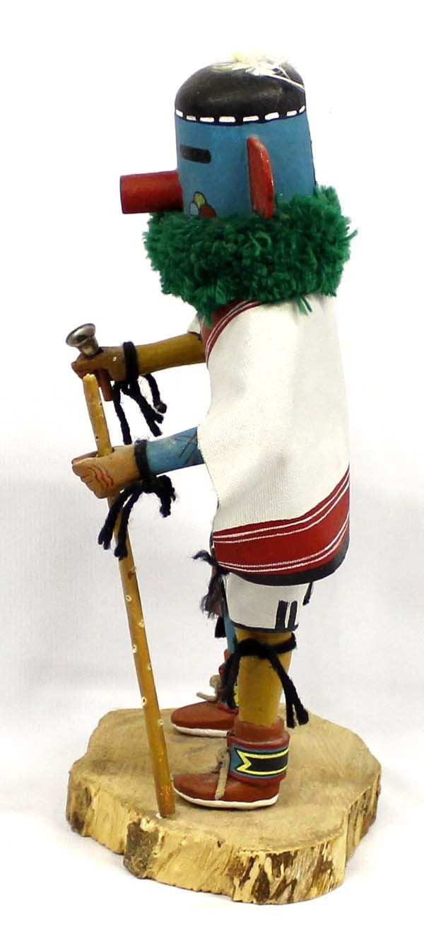 Native American Hopi Talavai (Morning Singer) Kachina by Larry Brooks, Sr., measures 13''H x 7''W x 6''Deep and is signed on the bottom, embellished with yarn, feathers, leather, painted canvas-like cloth, walking stick, and metal bell, piece is missing off of the back of his head