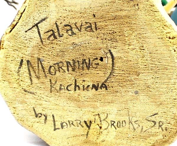 Native American Hopi Talavai Morning Singer Kachina by Larry Brooks, Sr., measures 13''H and is signed on the bottom