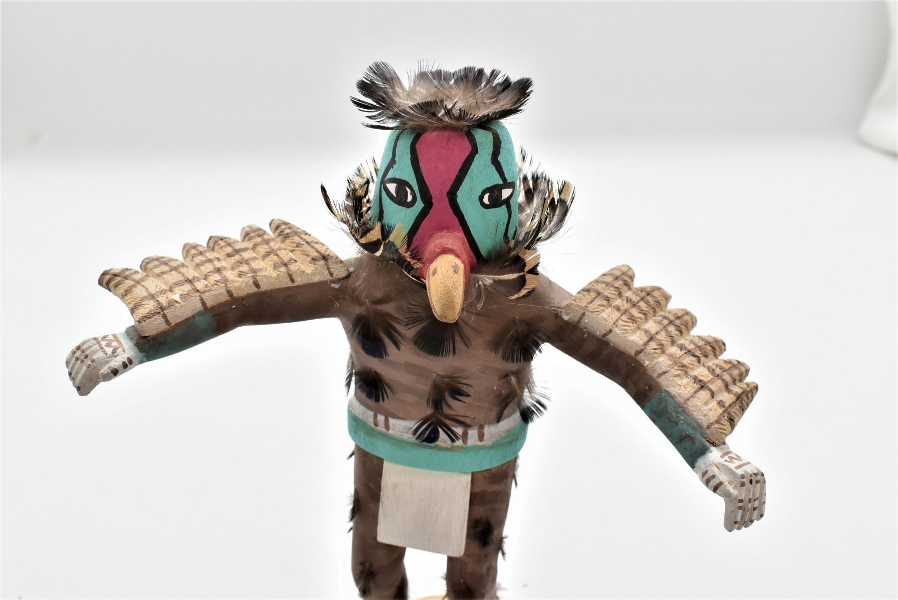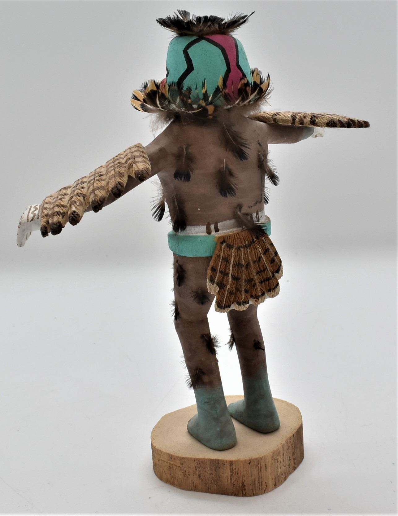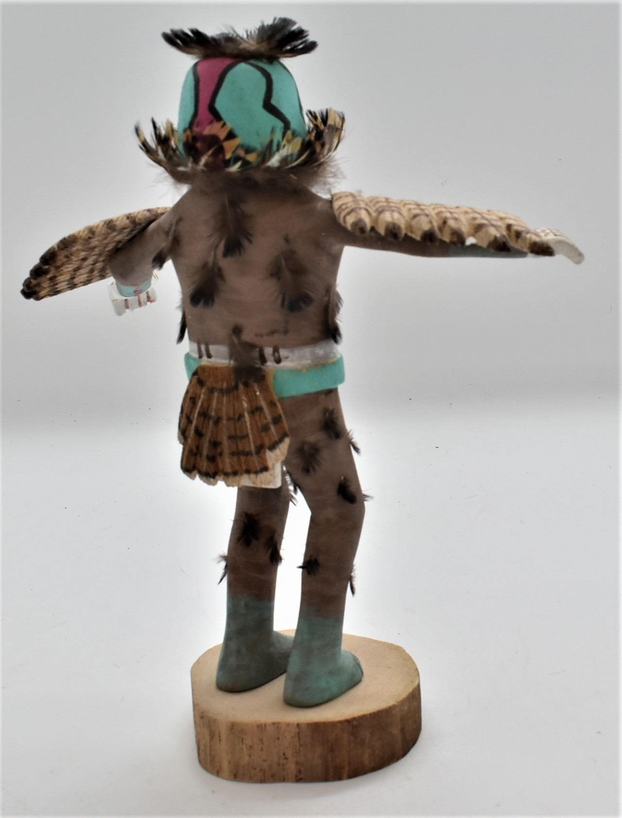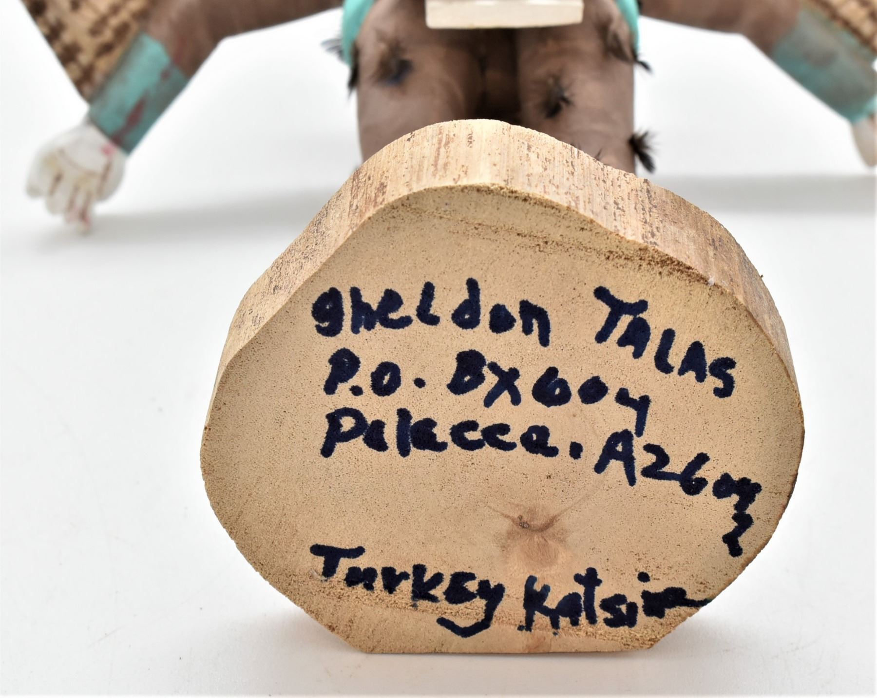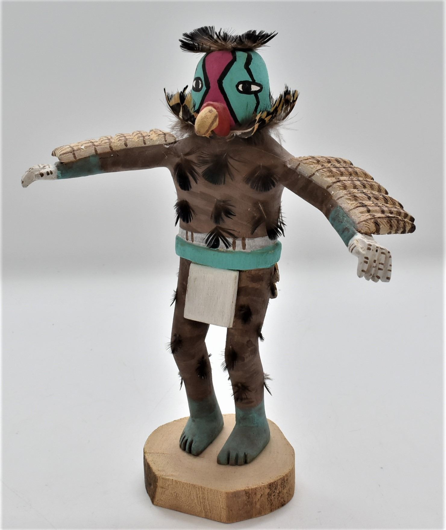 Native American Hopi Turkey Katsina by Sheldon Talas from Polacca AZ, measures 8.5''H x 7''W x 3''Deep, embellished with feathers and is signed on the bottom