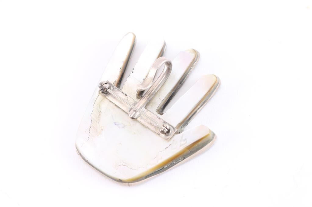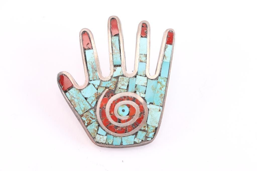 Hand design with coral, abalone and turquoise, marked MCL. 30 grams total weight. 3" x 3".