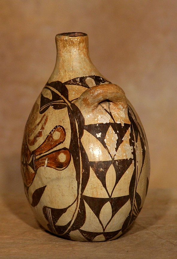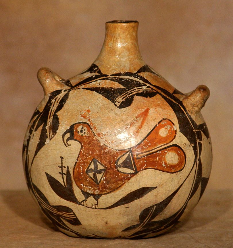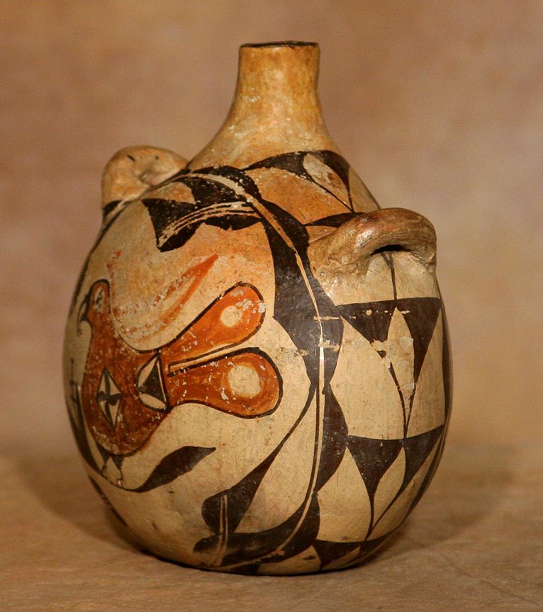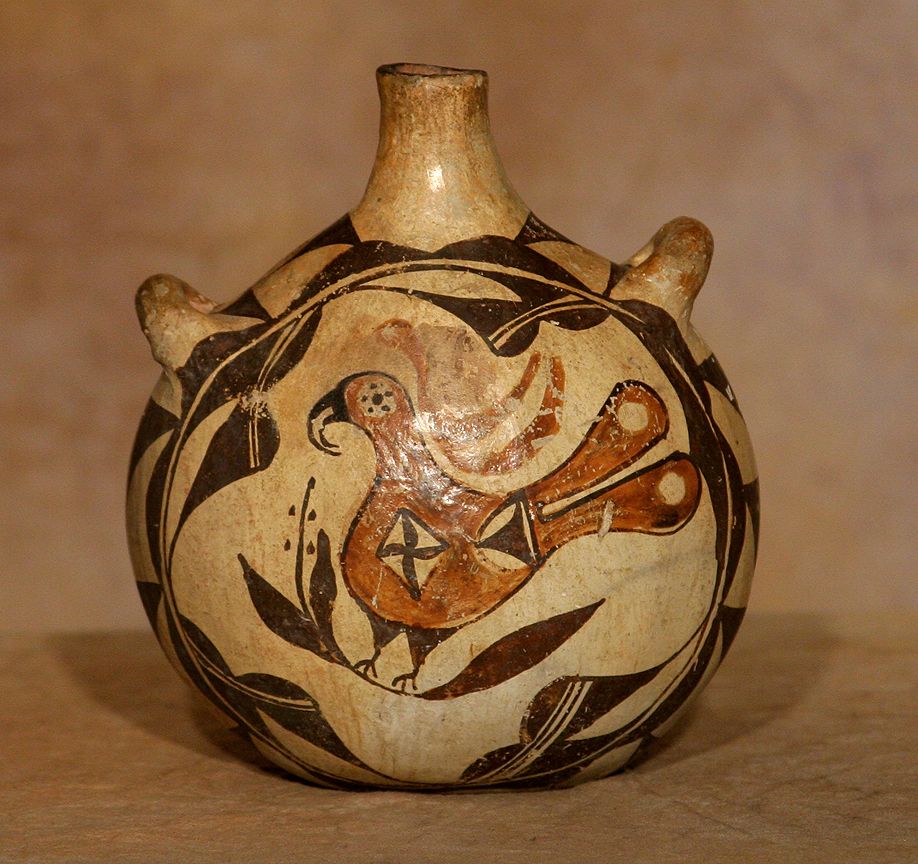 Hopi Upright Canteen. 8" x 6 ½" x 4". Polychrome painted, perched birds encircled by a band of geometric designs. Early 1900s. (est. $900-1,200). CONDITION REPORTS: www.auctioninsantafe.com/docs/cr2012.pdf