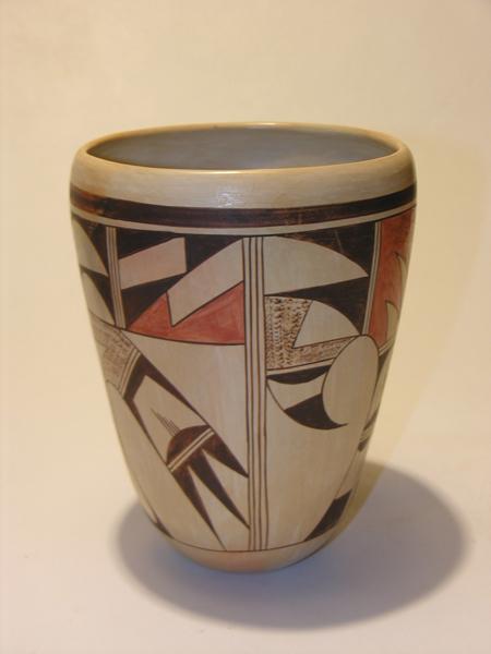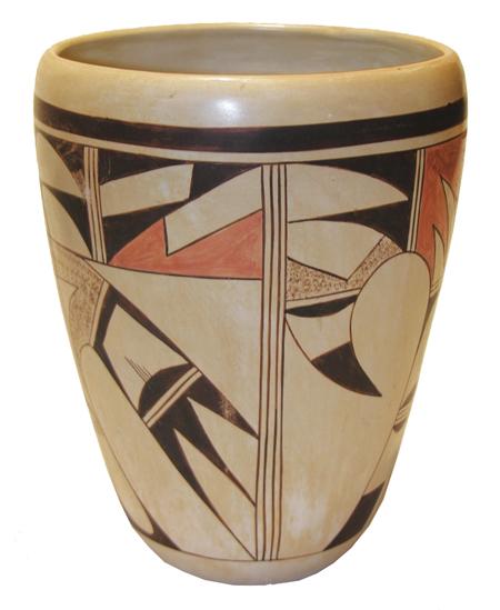 Circa 1960s, Pristine Hopi polychrome cylinder vase with classic bird and geometric motif. With Frog Woman hallmark. 8" x 6"