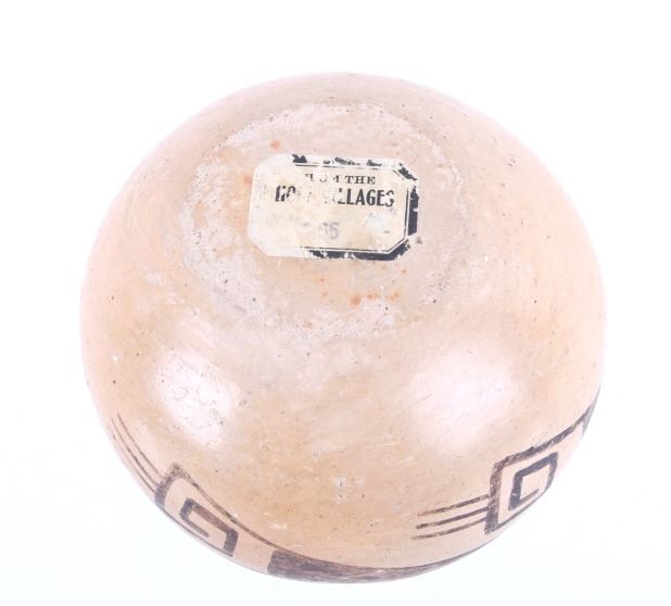 Featured in this lot is this polychrome pottery vessel from Hopi Village, circa 1940's. This pottery vessel features a beautiful design of black and red on a cream ceramic background and shows a fire hardened or heat treated section consistent with traditional Hopi pottery. The condition of this pottery vessel is good, with some wear and fading due to age and weathering. The measurements of this pottery vessel are 2 1/4" x 3 5/8" x 3 5/8". This pottery vessel shows the Hopi Villages tag on the bottom of the pot.