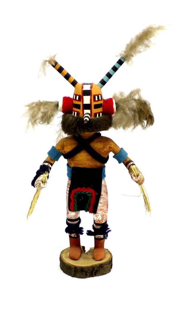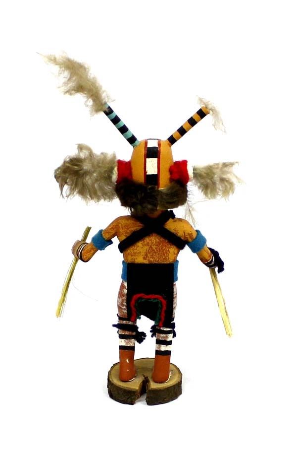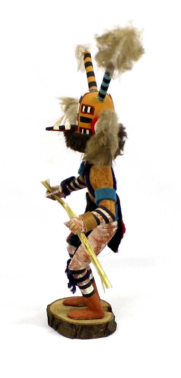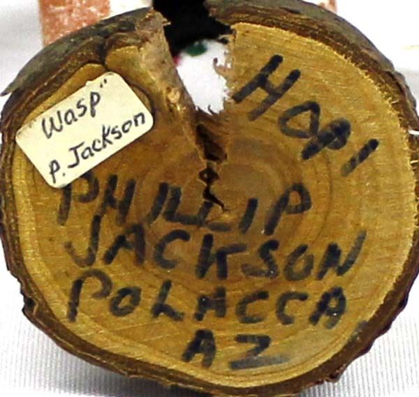 Vintage Native American Hopi Wasp Kachina by Phillip Jackson of Polacca AZ, measures 10'' x 4.5'' and signed on the bottom, embellished with feathers, faux fur, yarn, and felt, some feather damage