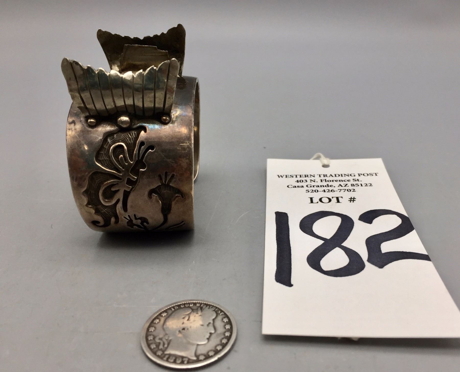 Description: Very nice sterling silver overlay watch bracelet featuring a butterfly and a flower in the design. Maker: Hallmarked by Winfield Humeyestewa, Hopi. Approx. Age: Circa 1970s - 80s. Size: Measures 5-7/8” with a 1-1/4” opening (fits a 7-1/8” wrist). Weighs 91.1 grams Condition: Good for its age, normal wear expected. Please look closely at the pictures - they are an important part of our description. Shipping: There will be a $5 handling / packaging fee for shipping this lot. The actual cost of postage will be added on top of that.