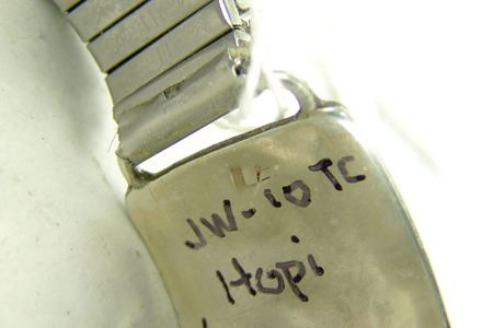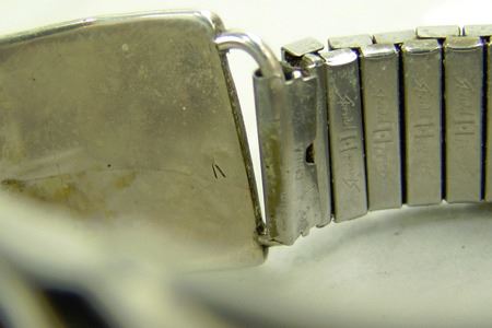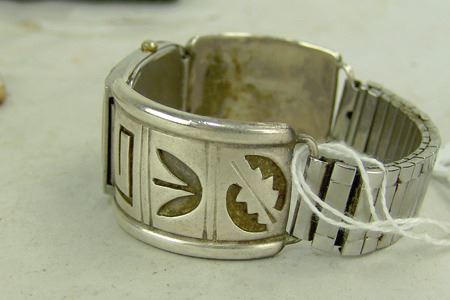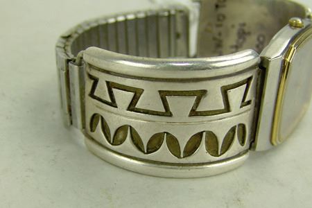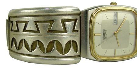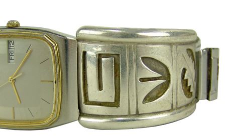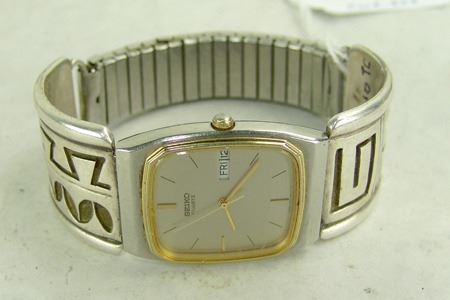 Ca. 1970s, Pair of fine silver-on-silver overlay watch tips with traditional motif, on flex band and with vintage Seiko watch. Very good condition (watch condition unknown). Men's M/L