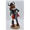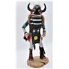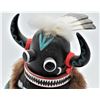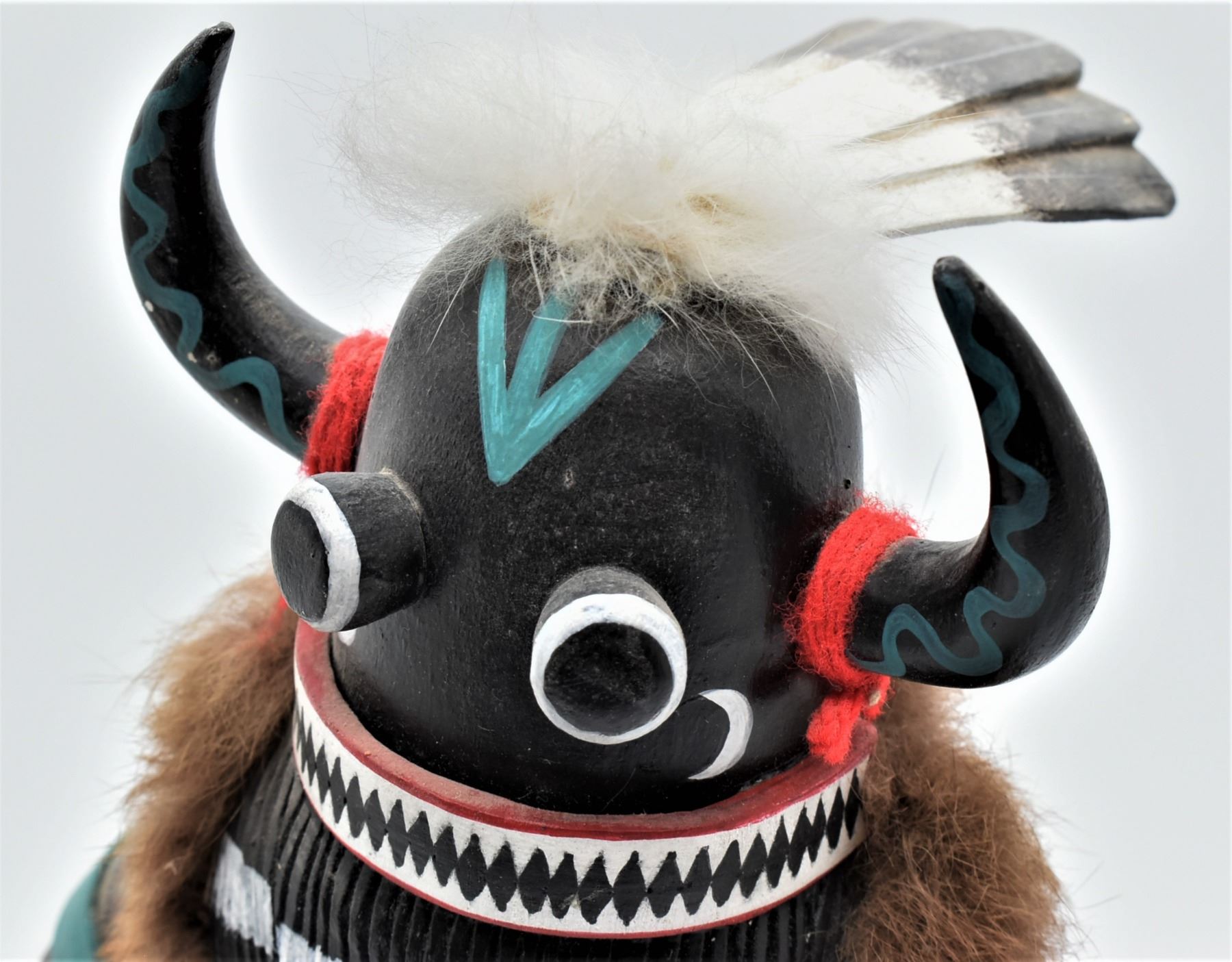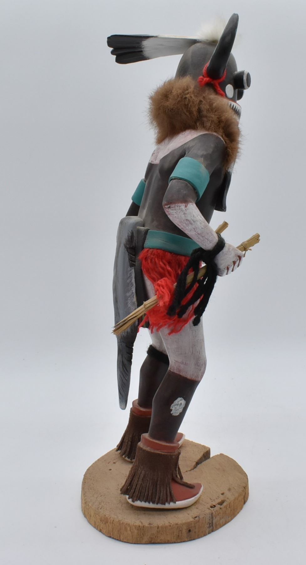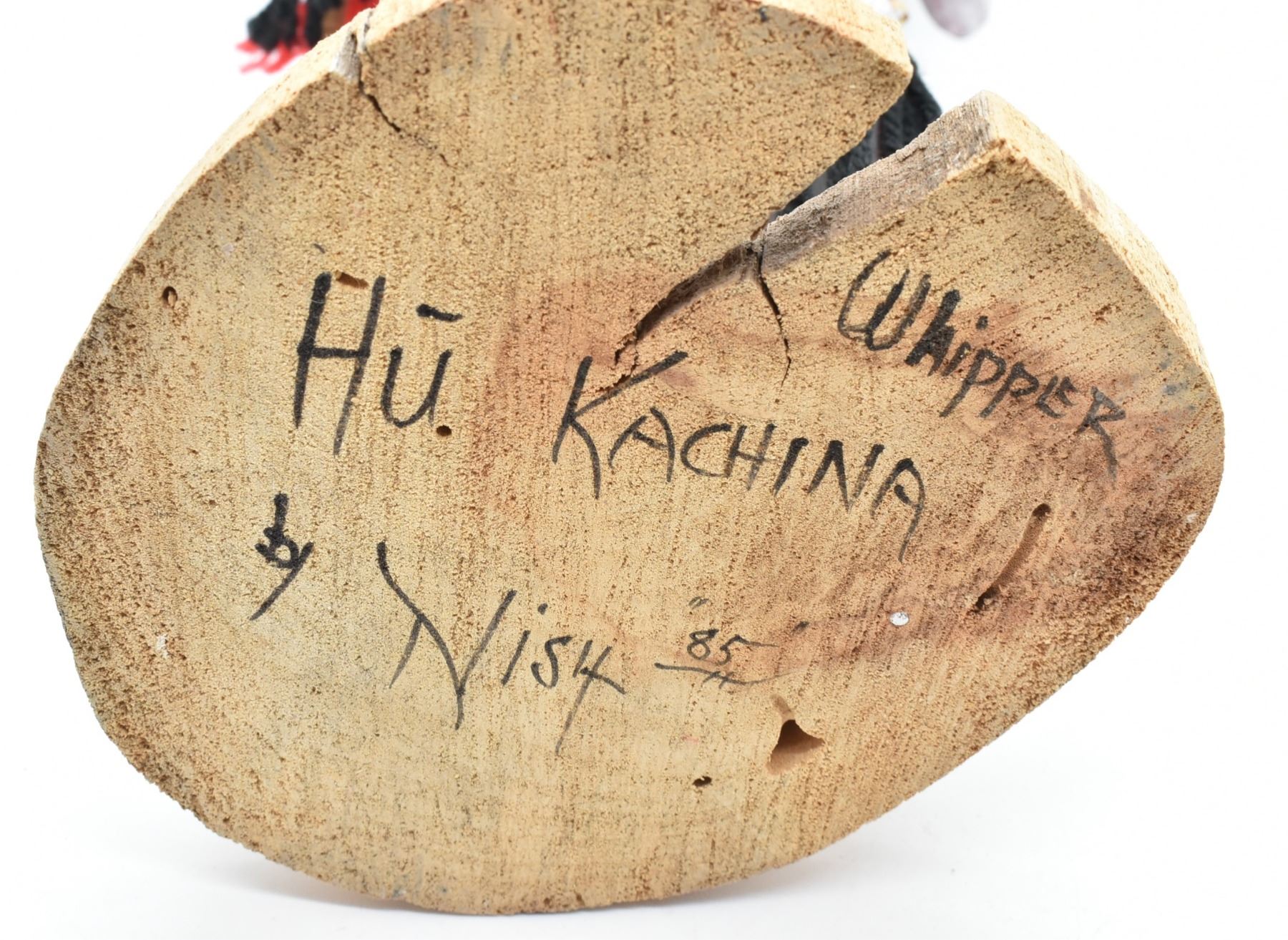 Native American Hopi Whipper ''Hu'' Kachina by Garfield Nish, measures 15''H x 6''W x 5.5''Deep and is signed on the bottom, embellished with fur, and leather, ''This representation of this ''Whipper Hu'' Kachina was made by a Hopi carver named Garfield Nish, who preferred to use only his last name.''
