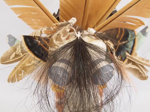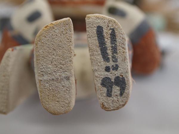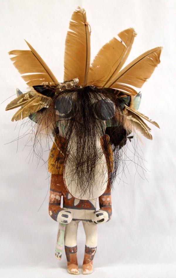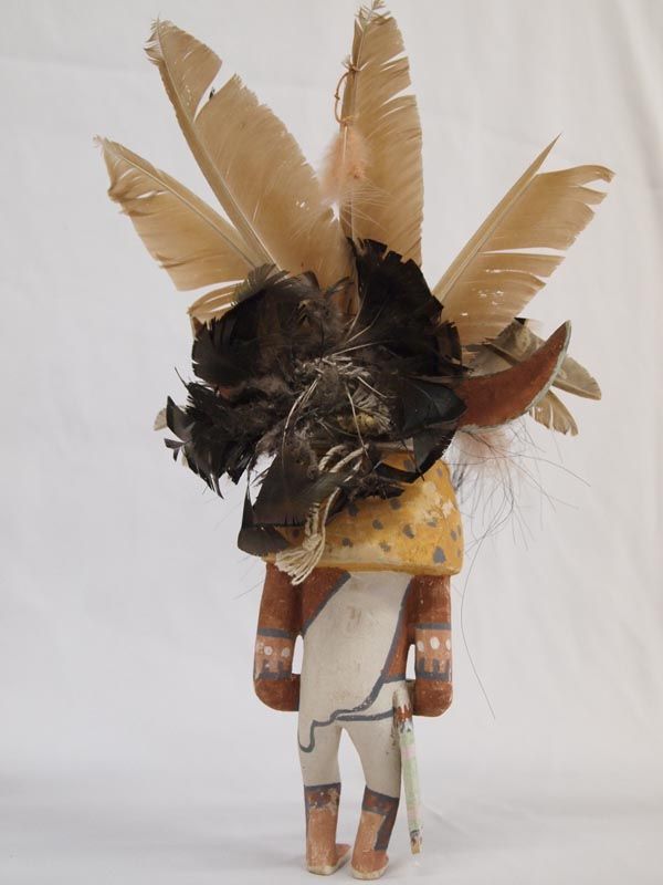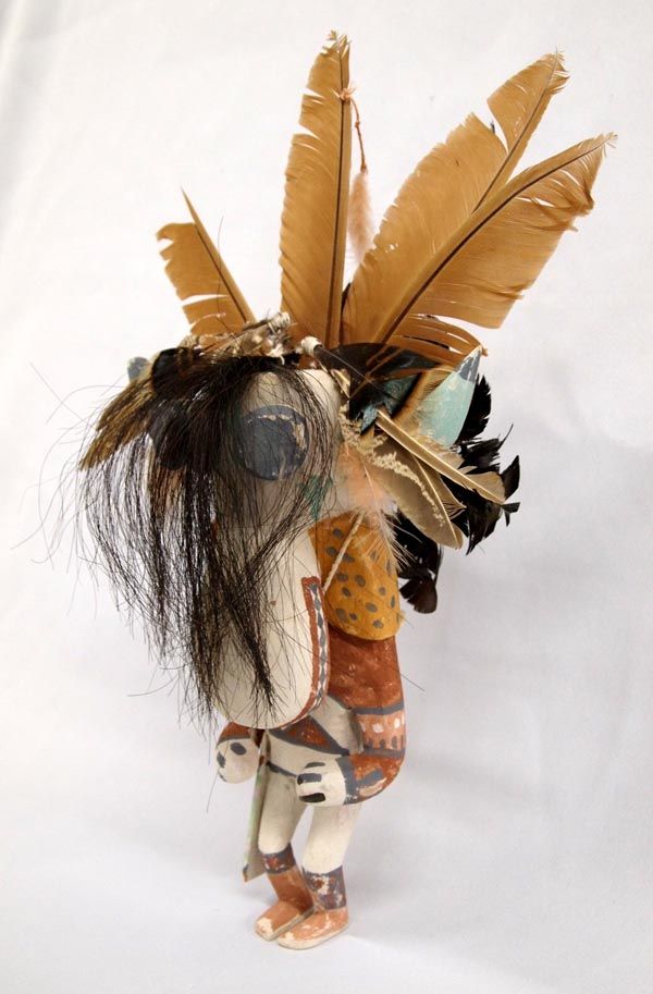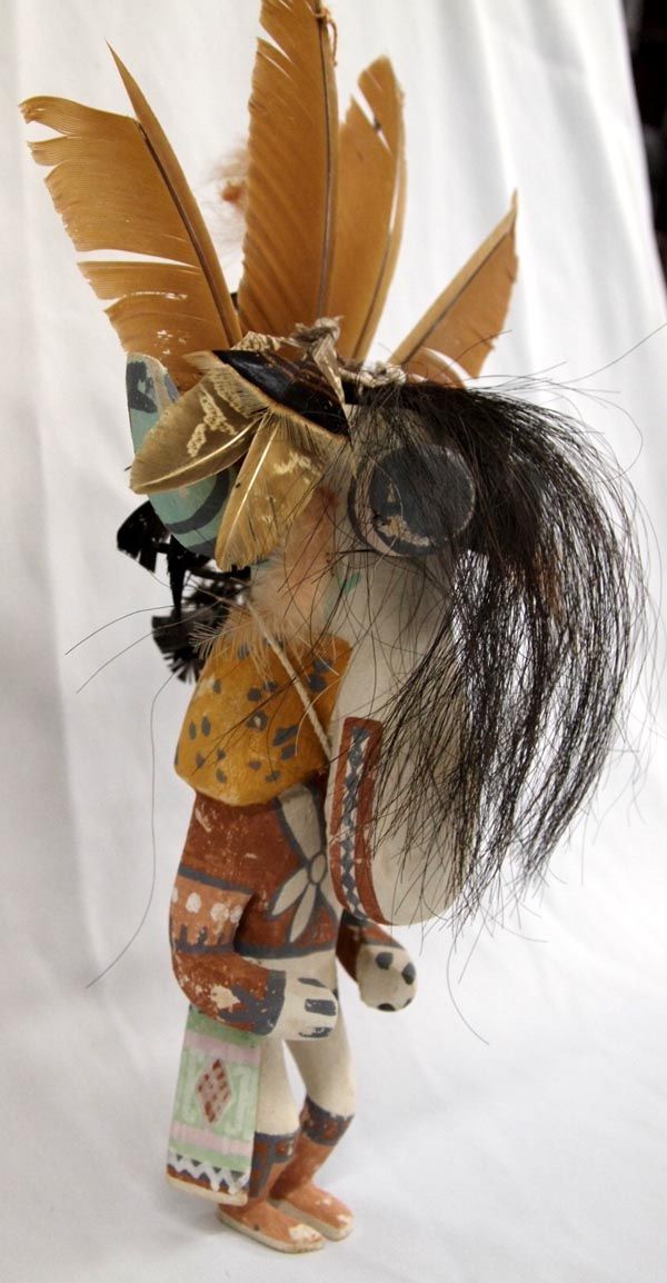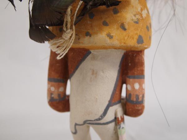 Hopi White Ogre Kachina - Clark Tenakhongva. Measures 15.5''H x 9.5''W. The feathers on this kachina are a bit tattered which actually adds fierceness to the figure. There are also some spots where the paint is worn. It is hallmarked on bottom for artist Clark Tenakhongva who was born in 1956 and comes from a long line of accomplished Hopi carvers. Clark, along with other young carvers have rekindled the traditional style of Hopi doll carving, like their Grandparents who were actively carving in the early 1900's. These dolls closely resemble those dolls made at the turn of the century. Working in the traditional style, Tenakhongva applies natural pigments and does not use a wood burner. His cylindrical figurines with exaggerated heads represent, in his view, the spiritual intent of the kachina. ''The contemporary dolls are so detailed that they get away from the real meaning of the doll itself,'' he says. ''People refer to kachinas as works of art, but for us they are created for their ceremonial significance. When you do contemporary dolls, you get away from tradition and the original reason they were carved in such a fashion.'' ''Kachinas are the living spirits themselves,'' he points out, ''and the term 'kachina dolls' actually has no meaning. More accurately, what I make is called the 'ti-hu' (tee 'hoo).'' His work bears the Tenakhongva signature trademark of the Rabbit Clan, a rabbit footprint. This is the White Ogre or Whiharu kachina. The Wiharu functions in exactly the same way as the Nataska, only it appears in white. According to Barton Wright, Kachinas: a Hopi Artists Documentary (78), ''The fearsome Nataska always come as a pair. They accompany the Soyoko on their collection trip and usually stand directly behind the member of the crew who is bargaining with the relatives of the children. They are supposed to be able to eat a child whole; from the very earliest age, the child has heard stories of these monsters - how they would descend on children playing near the village and haul them away to cook and eat.'' The White Ogre represents good. He stamps and clacks his large beak as he awaits his food or a chance for a child. He accompanies Soyoko on collecting trips. (Soyoko or Ogre Woman who appears in the evening after the Bean Dance. She visits various houses and asks the boys to hunt game-mice and rats-for her, and threatens that if they do not have some for her in four day's time she will eat them instead. She also requires the girls to prepare paper-thin wafer bread called piki made from blue, yellow, or pink corn meal.) The purpose of these Katsinas is to reinforce the Hopi way of life to the children of the Pueblo. These Ogres accompany Soyoko on her trip to collect food from the children. As a means of discipline, children are told the Ogres can swallow them whole, unless they are good children. The fierce and threatening behavior of these Katsinas strikes fear into the children, but they are eventually saved from imminent danger by the people of their Pueblo.
