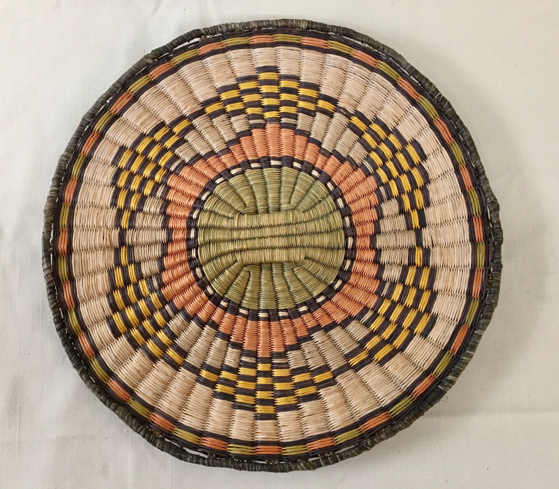 Description: Offered in this lot is a woven Hopi wicker plaque basket featuring oranges, greens, yellow and blacks in sort of a star pattern. Maker: Unknown Hopi weaver. Approx. Age: Circa 1970s. Size: 13-1/4”wide. Condition: Good for its age, normal wear expected. Please look closely at the pictures - they are an important part of our description. Shipping: There will be a $7 handling / packaging fee for shipping this lot. The actual cost of postage will be added on top of that.
