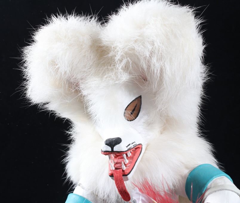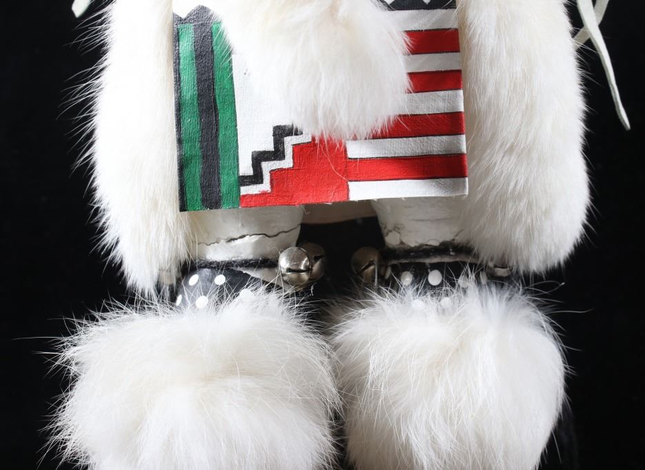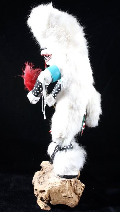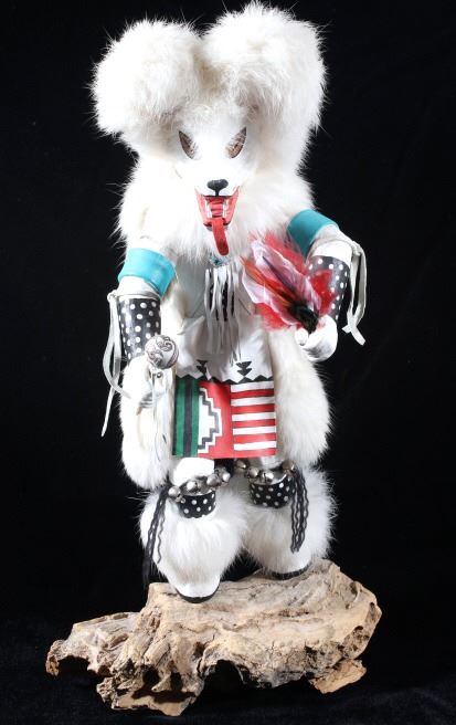 Featured in this lot we have a Hopi Native American wolf dancer Kachina doll originating from the early to mid 20th century. The Kachina shows hand made figure with hand painted designs across the face, arms, and legs. The doll is shown with white fur covering most of the piece with leather clothing and accessories. The leather across the front shows hand made geometric designs in colors of red, black, and green. The figure also shows yarn bands around the legs with bells along the length. The figure is holding a rattle in one hand and a collection of multi colored feathers in the other. The piece shows good condition overall with a crack in the right arm and one of the legs. The Kachina measures 17" tall overall with the figure measuring 14 1/4" tall by 6" wide.