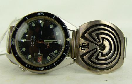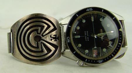 Ca. 1970s, Well executed traditional silver-on-silver overlay watch tips featuring the famous "man-in-maze" design. Very good condition. 7-1/4" x 1-5/8"
