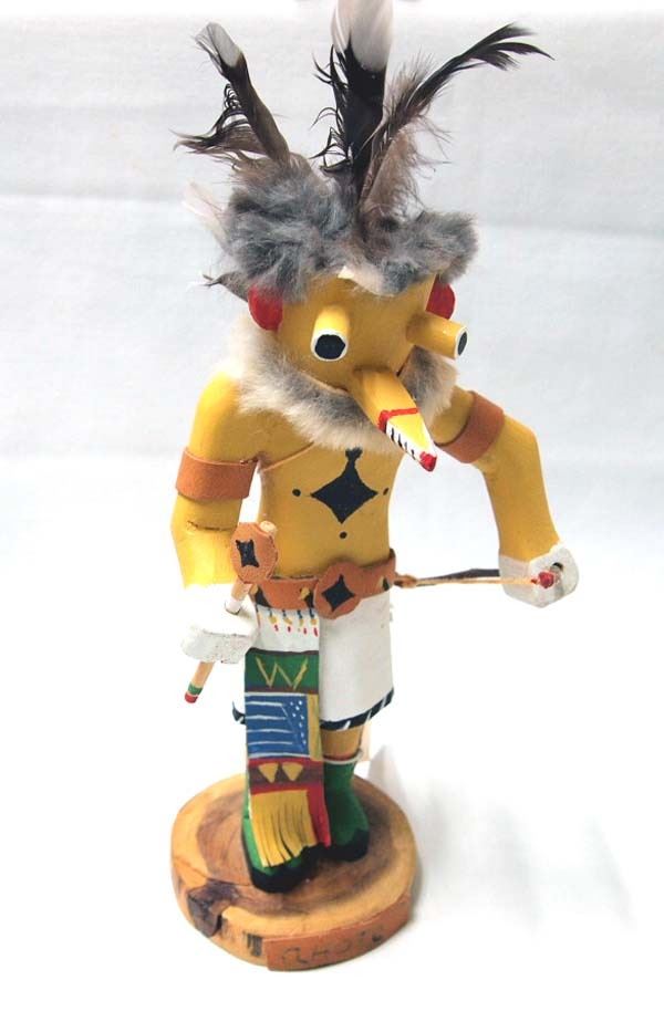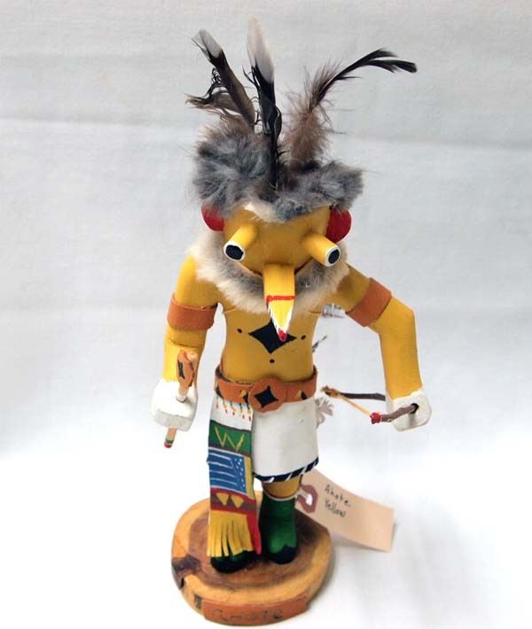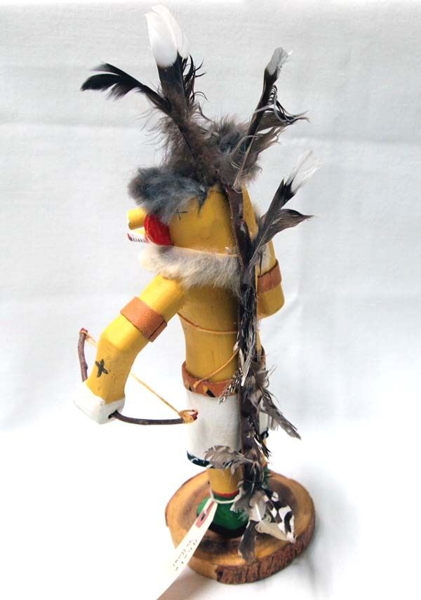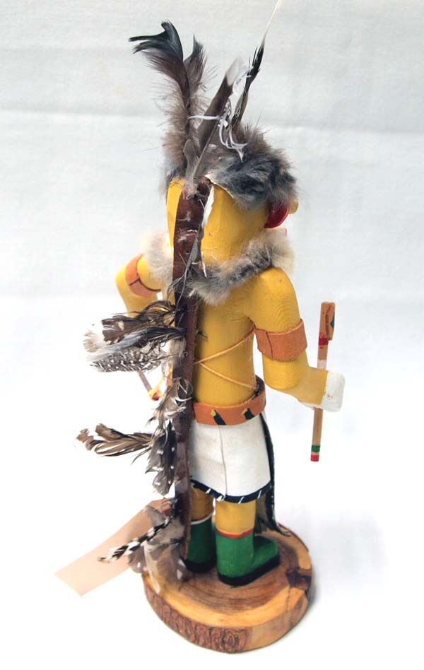 Native American Hopi Yellow Corn ''Ahote'' Kachina, measures 11.5''H x 5''W x 5.5''Deep, embellished with feathers, fur, and leather, beautiful carved and hand painted