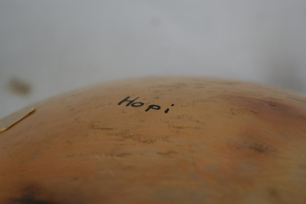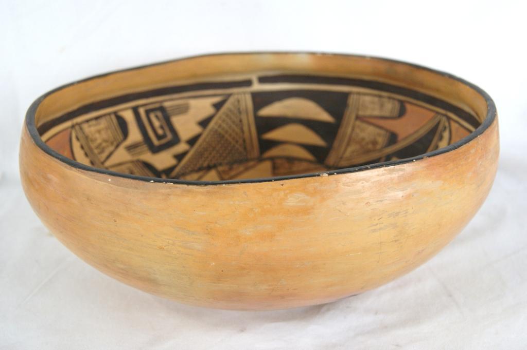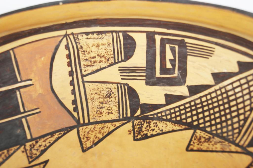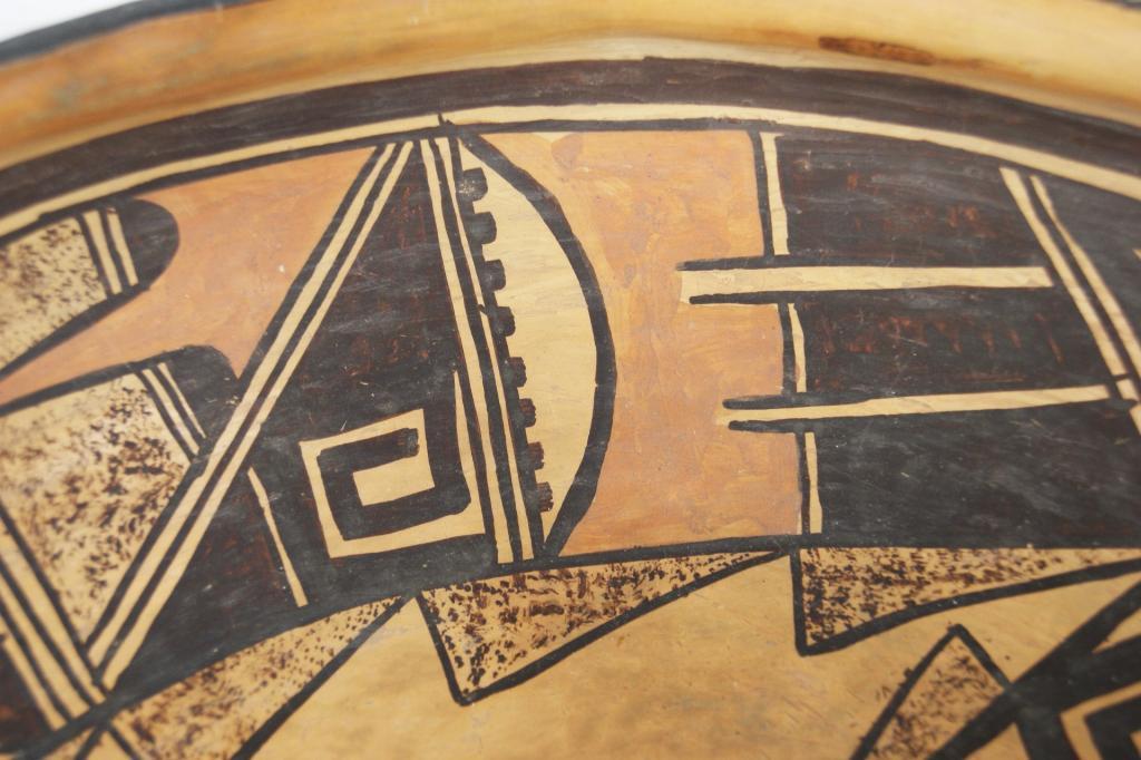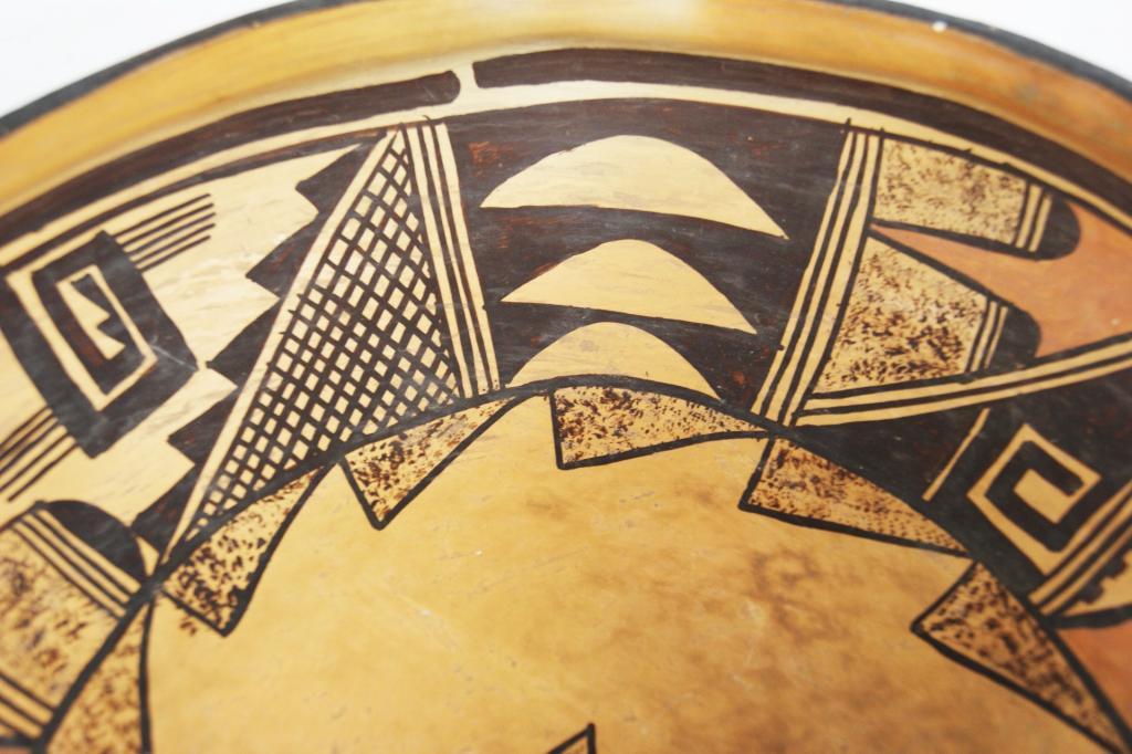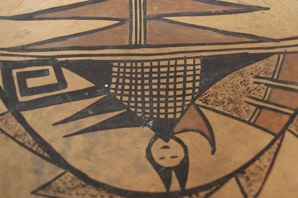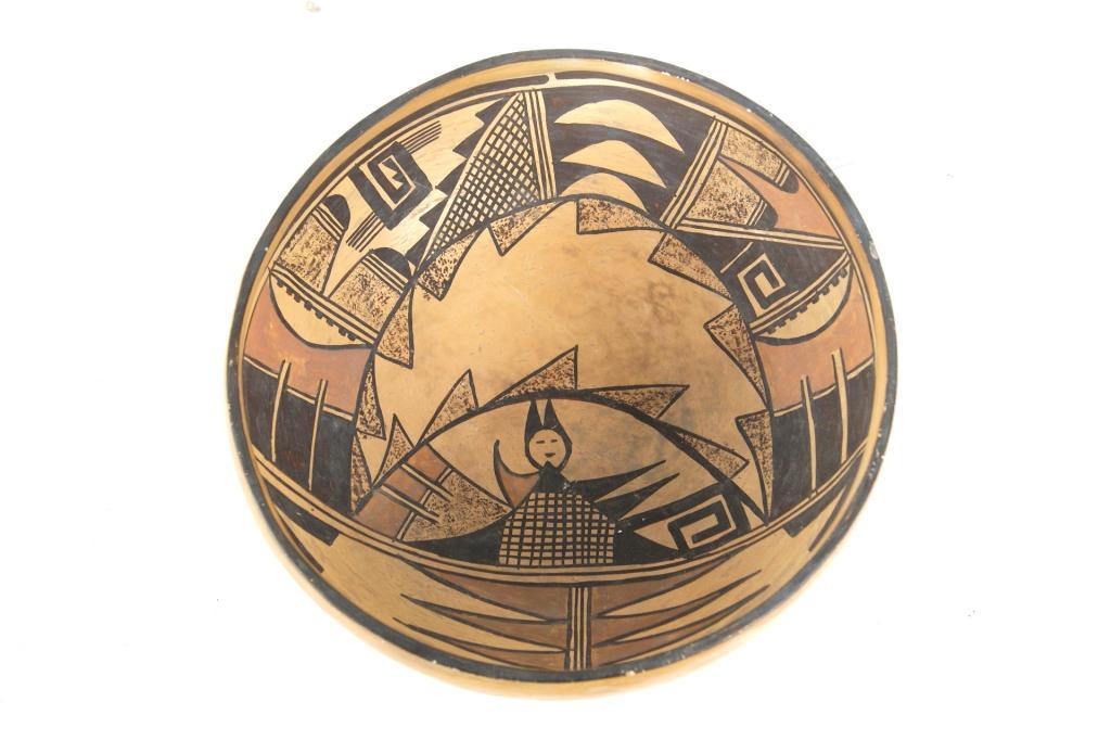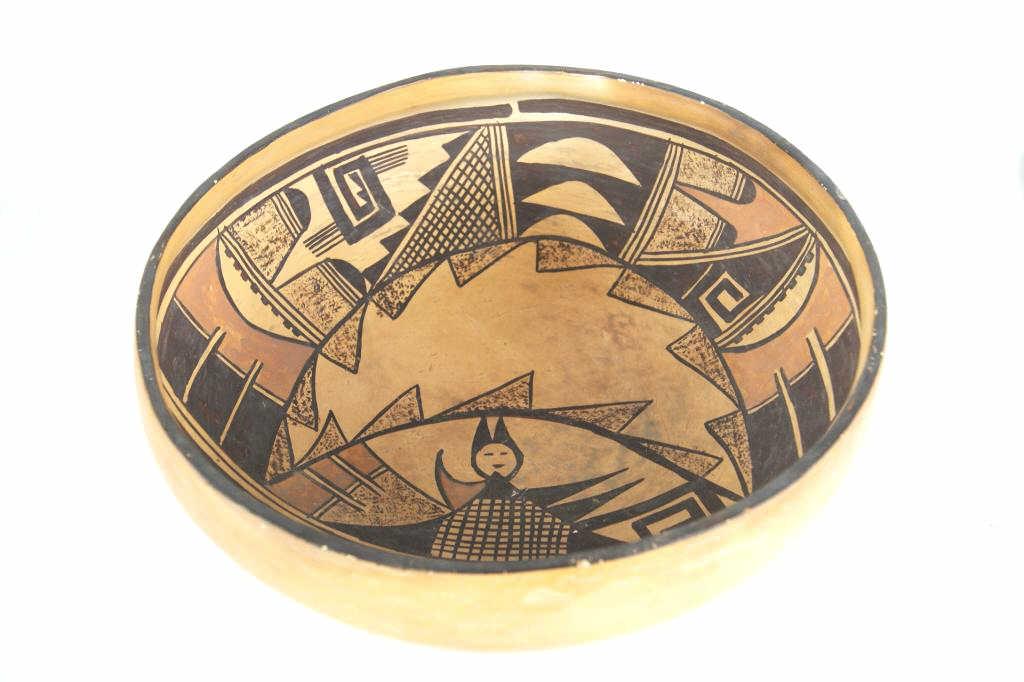 Hopi polychrome figural bowl - 11"d x 4"h from Ojai Valley Museum...Provenance: Robert Owen Browne Museum Collection note free style approach to image depicting figure center 1900-1920