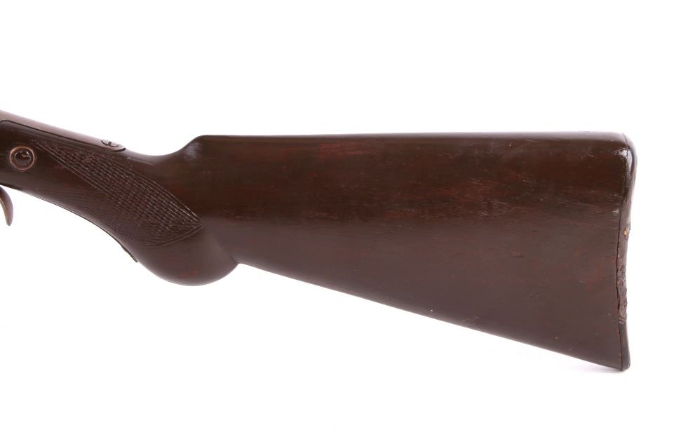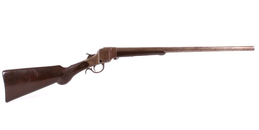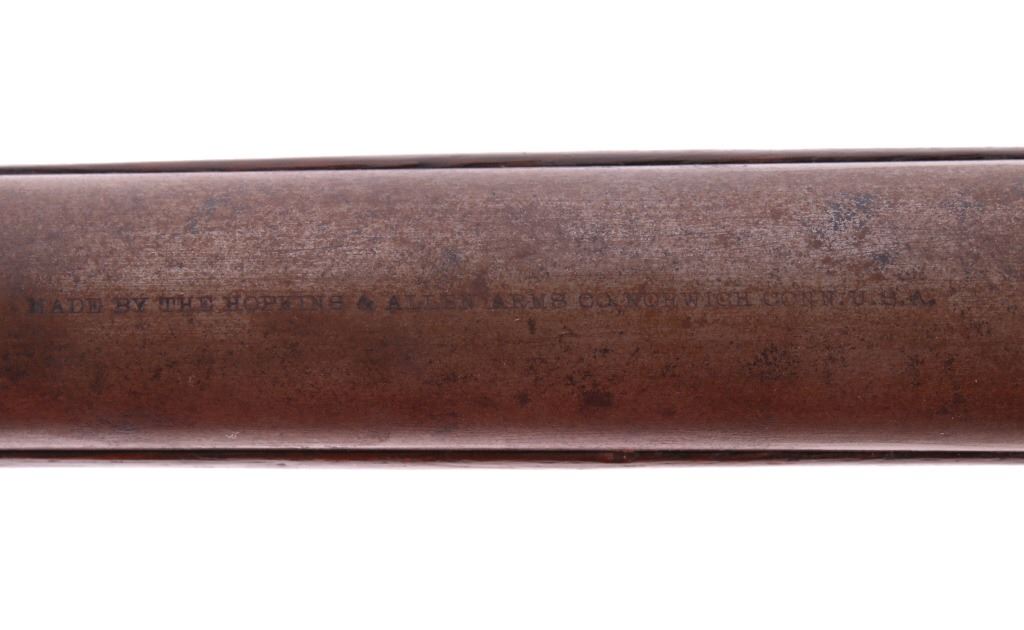 You are bidding on a Hopkins & Allen Falling Block Single Shot 16 Gauge Shotgun. The shotgun features a 23 3/4" round barrel, exposed hammer, falling block design, hard rubber butt pad, and checkered forearm and checkered pistol grip. The shotgun shows good condition, showing some loss to the original finish. Serial Number: 206. This firearm qualifies as an Antique, and does not require FFL Transfer or NICS Background Check.