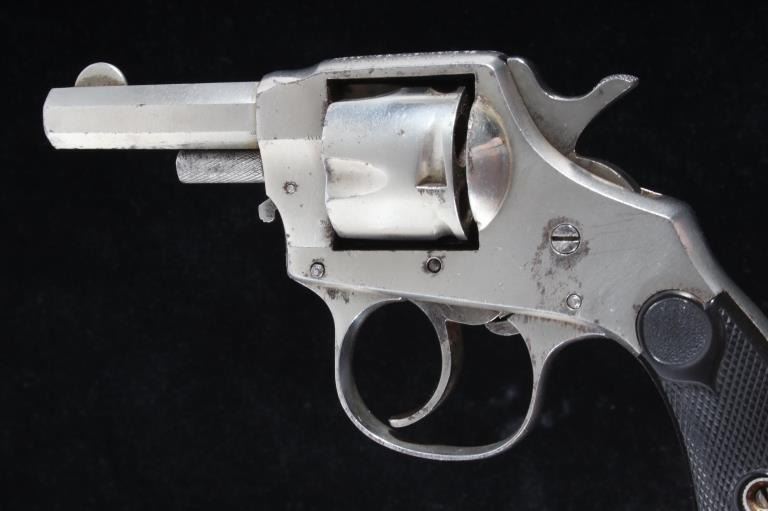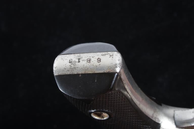 This is an early Hopkins & Allen Arms Co. Norwich CT. U.S.A. Model X.L. Double Action revolver. The revolver shows a serial number of 8813 and was manufactured from circa 1898 to 1916. The pistol shows a 2 1/4 inch full octagon barrel and is chambered in .32 Smith & Wesson caliber. The handgun has a nickel factory finish showing near mint condition with some spotting and signs of use with very good condition factory hard rubber checkered grips. Working without flaw in both single and double action would descript the functional condition of this firearm accurately as it is a shooter. Curio and Relic, FFL Transfer or NICS Background check required.