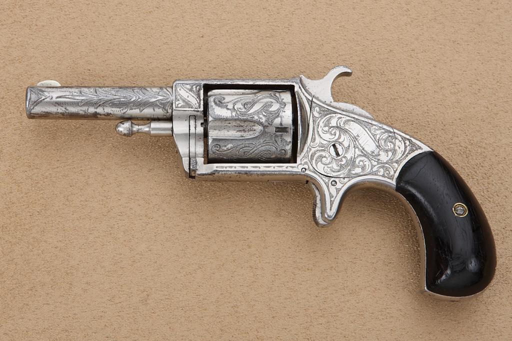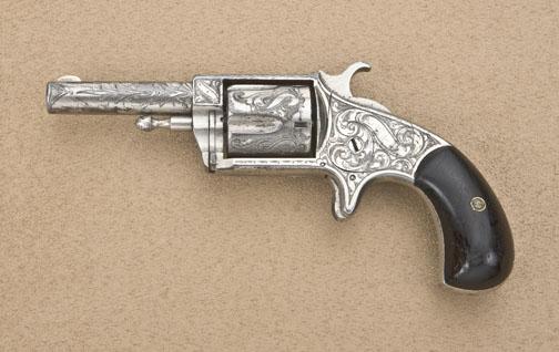 Hopkins & Allen Blue Jacket No. 2 Model spur trigger revolver, .32 cal., New York style period engraved, 2-1/2” barrel, nickel finish, wood grips, #X 111. This gun is in overall fine condition showing approx. 60%original finish, nice engraving including the name “L. Miller” scratched in the presentation panel on the left side of the frame; good action, only fair bore, very good grips with some wear and minor scratches.Est.: $400-$800.