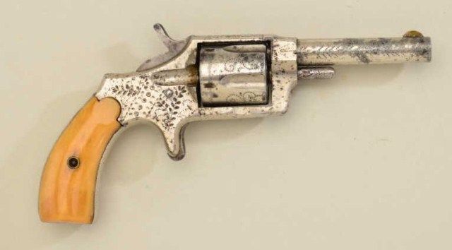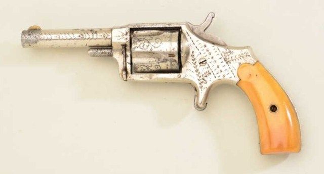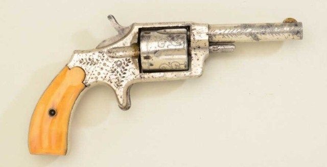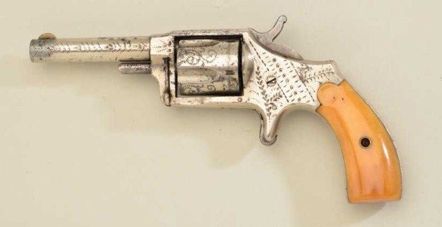 Hopkins & Allen Blue Jacket No. 2 spur trigger revolver, intaglio-style engraved, .32 cal., 3” round barrel, bone grips, #5984. This gun is in overall very good condition showing considerable nickel finish withbalance gone to silvery tone, some scattered pin prick pitting, period engraving, good action and markings, fair bore, very good aged bone grips. Est.: $400-$800.