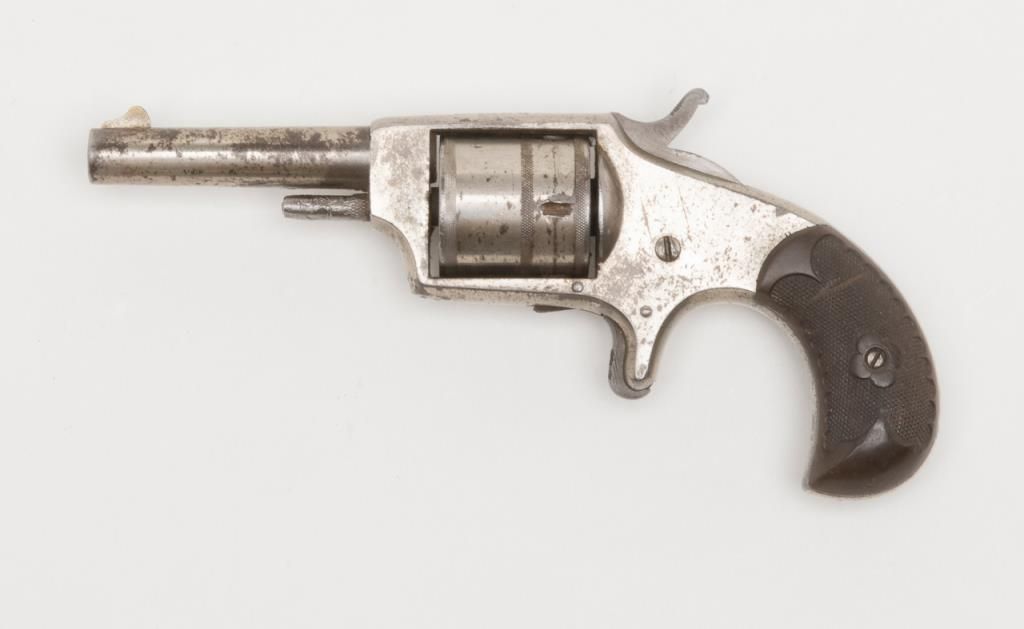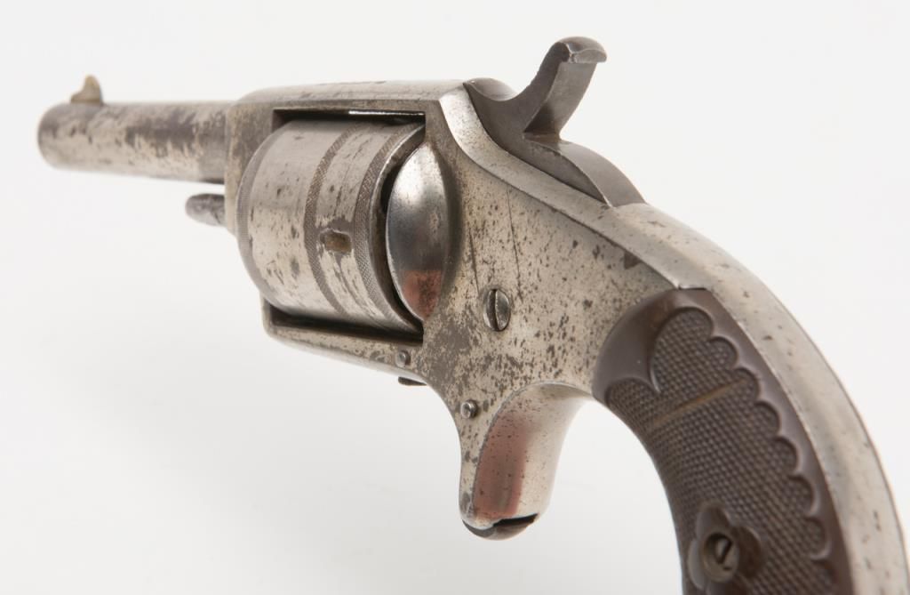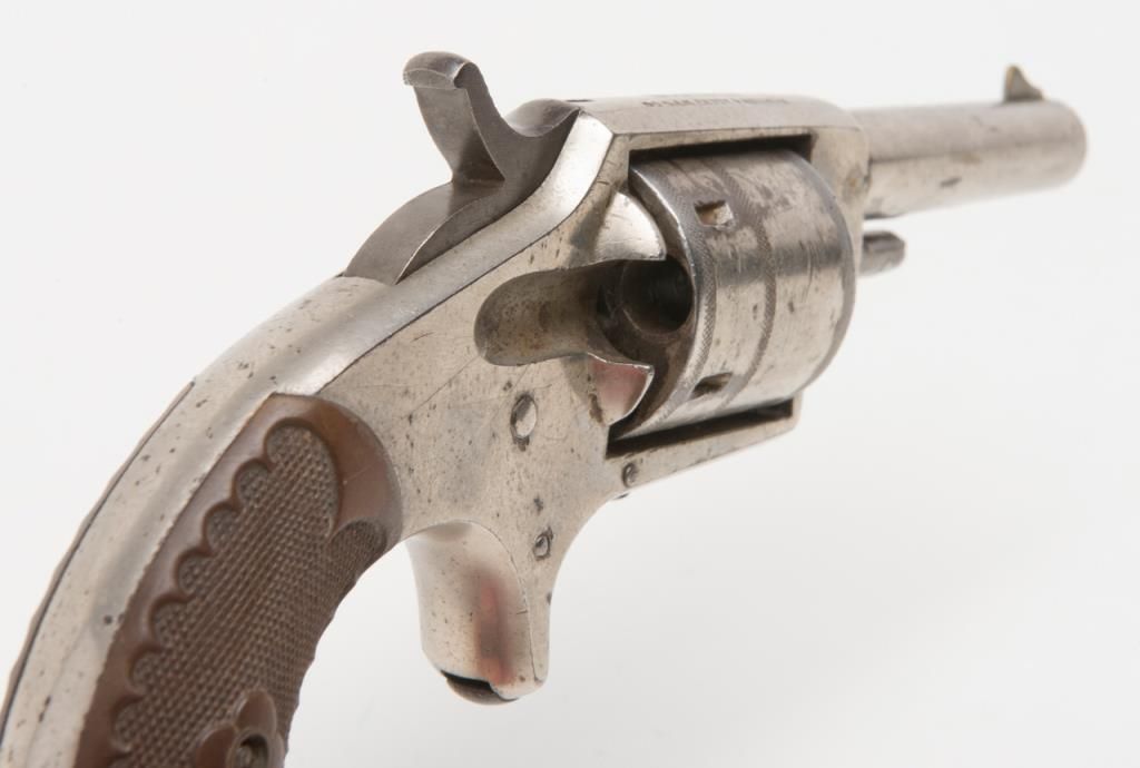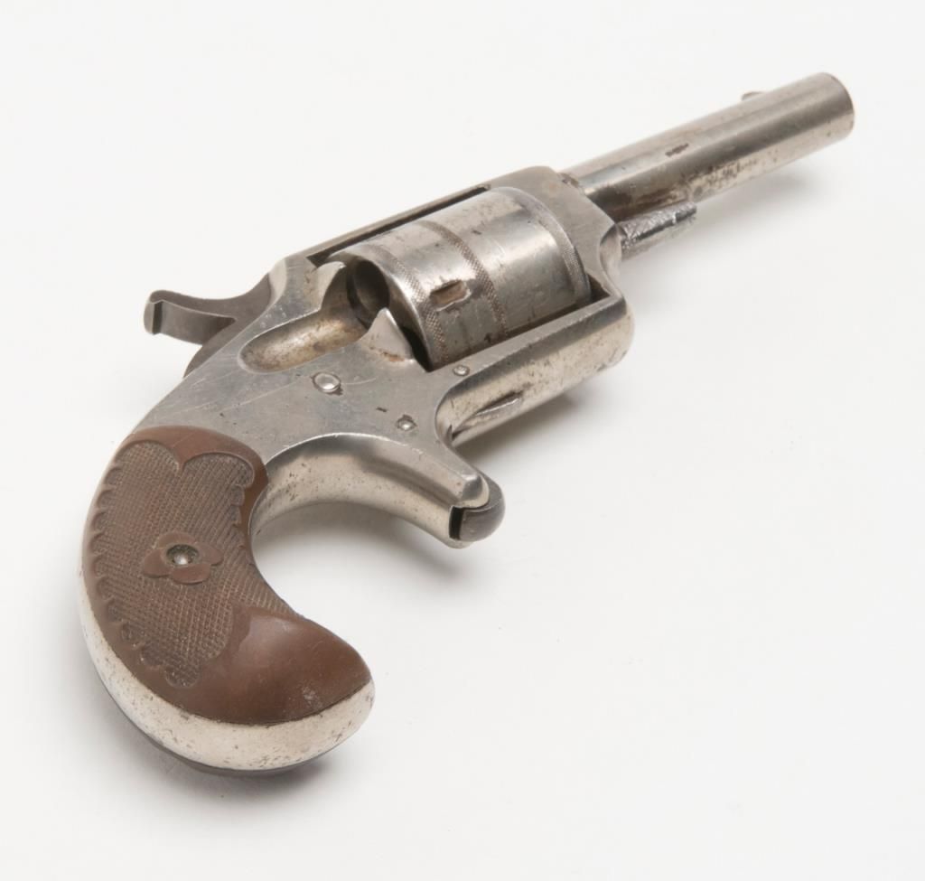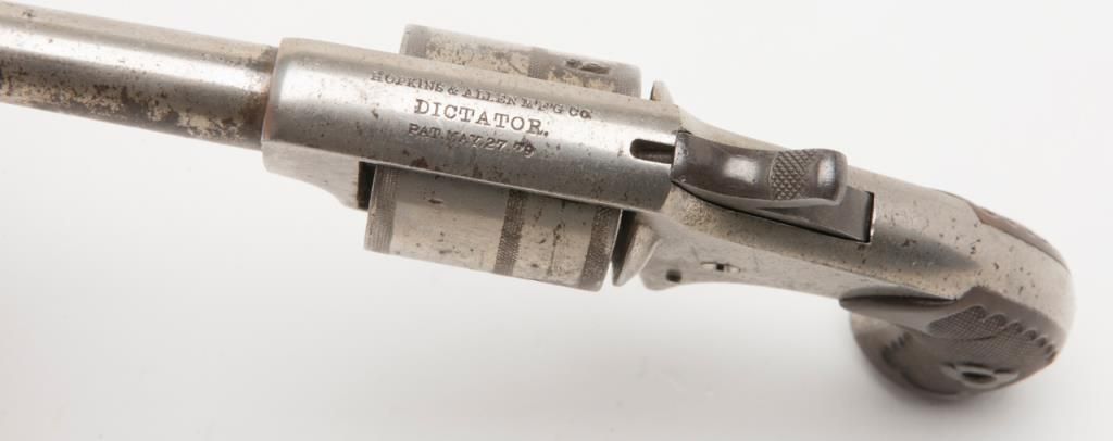 Hopkins & Allen Dictator spur trigger revolver, .30 cal., 3” round barrel, nickel finish, checkered hard rubber grips, #NVSN in overall fair to good condition showing considerable areas of original nickel finish, good action, fair bore,good markings and grips. (Antique). Est.: $50-$100.