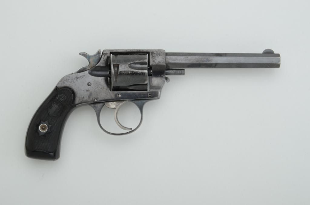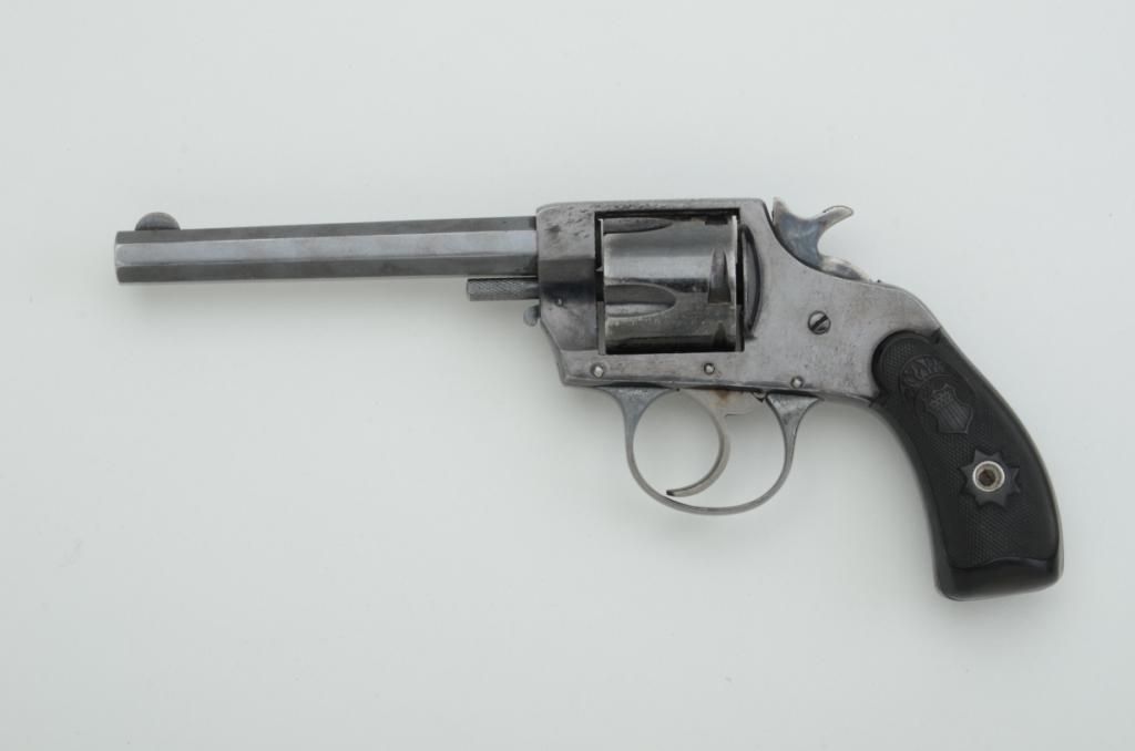 Hopkins & Allen Double Action No. 6 revolver, .38 cal., 4-1/2” octagon barrel, blue finish, checkered Forehand & Wadsworth black hard rubber grips that fit impeccably, #2271. This gun is in overall fine conditionshowing approx. 75% original blue finish, very good bore, action, markings and fine grips; fiery case colors on hammer; scarce in blue as nickel finish was preferred by customers in the late 19th century. Est.:$150-$300.