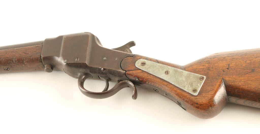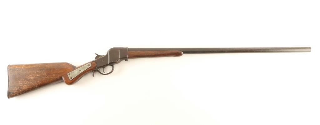 Antique falling block single shot shotgun with a blued finish, 30.25" barrel, no visible extractor, removed front sight, smooth trigger, knurled hammer spur, 's' shaped finger lever, checkered wood schnabel forend and pistol grip shoulder stock with smooth metal buttplate. The majority of the metal surfaces display an aged brown patina with dark scattered rust. Bluing is retained under the forend and trace amounts can be found in protected areas. Action is functional, the bore is fair and the wood stocks are poor with a crude repair at the wrist. Condition is NRA Fair. ***Antique Firearm***