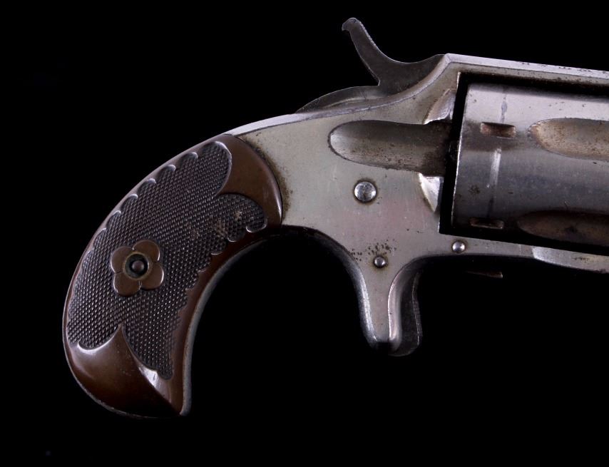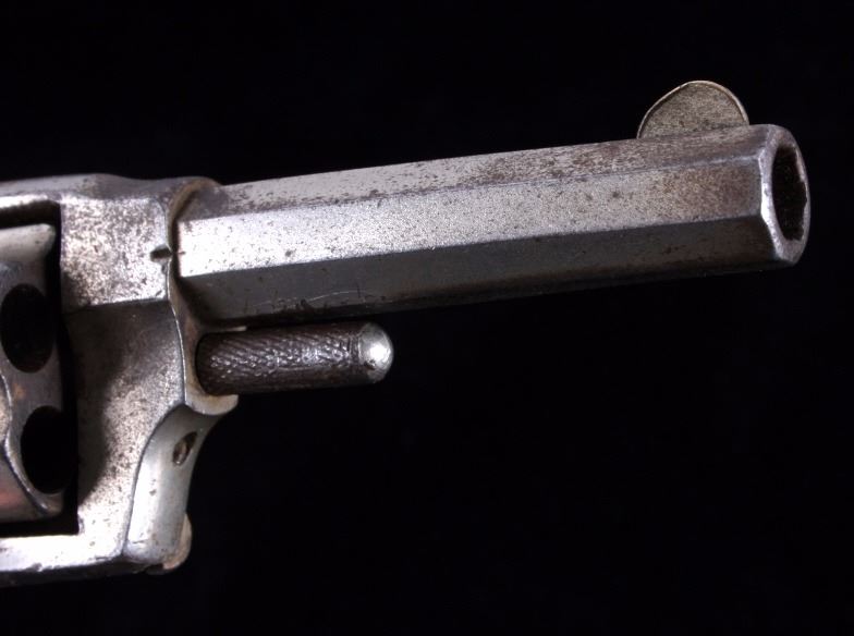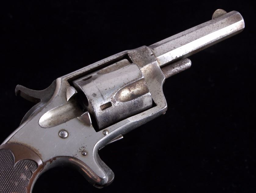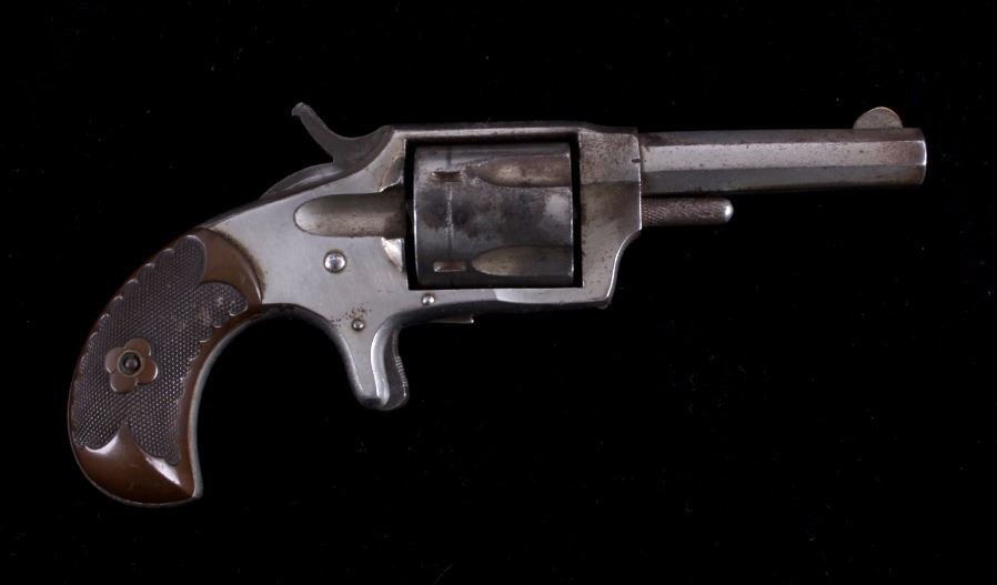 This is an original Hopkins Allen .32 Mountain Eagle revolver from the 1880's. The pistol is marked "G.W.T.&R." and was sold by G.W. Turner & Ross, a Boston retailer. The gun is also marked "Mountain Eagle" and features an octagon barrel and five shot cylinder. The pistol is in good condition. It measures 7" long.