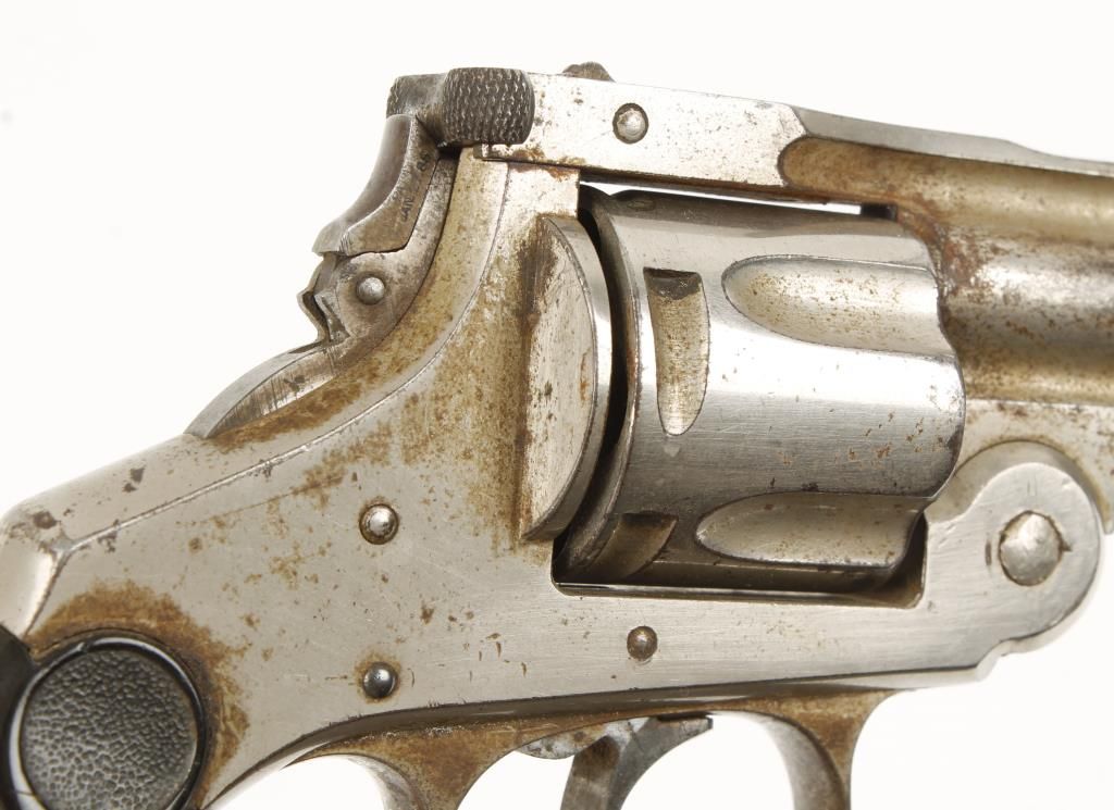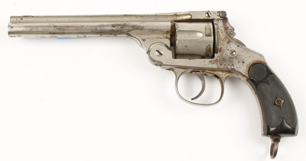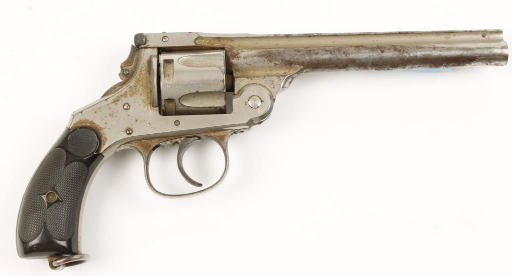 Double action 5 shot top break revolver with 5-1/2" barrel. Nickel finish, checkered hard rubber grips, folding hammer, lanyard ring and fixed sights. Made in early 1890s. Fair bore and action. Condition: Good showing 60% original finish.