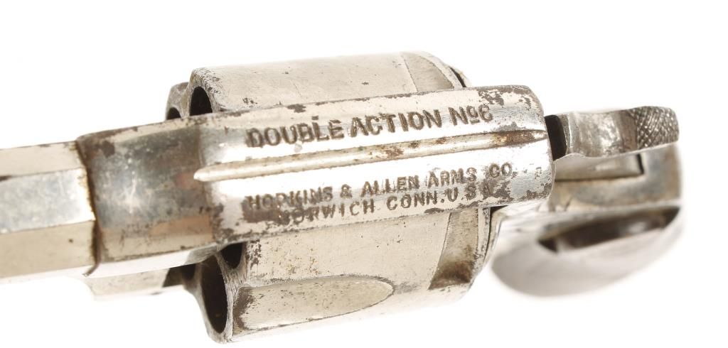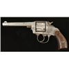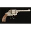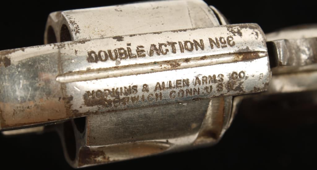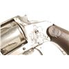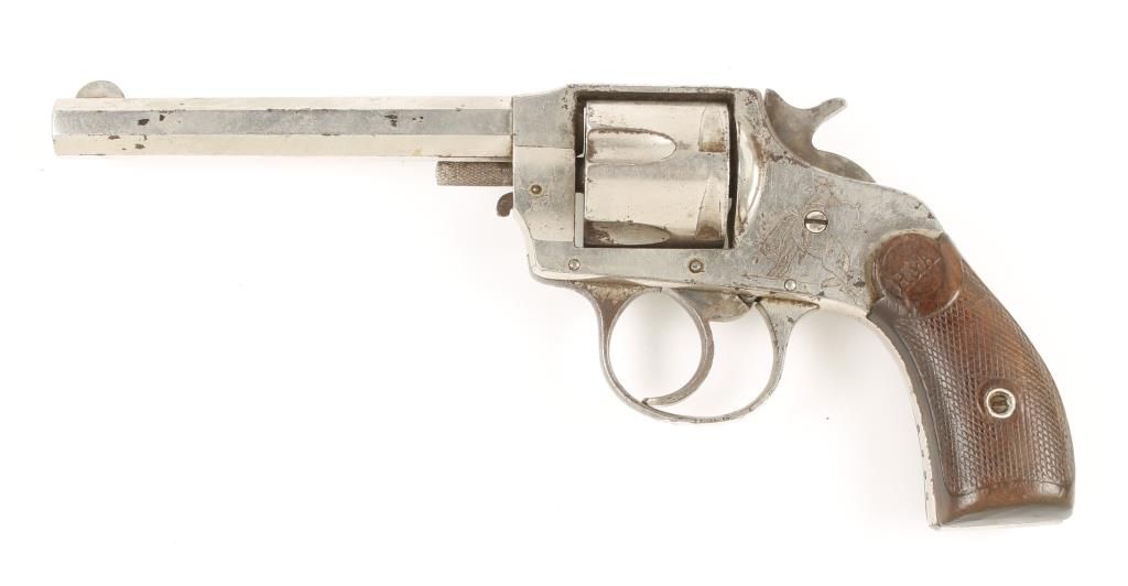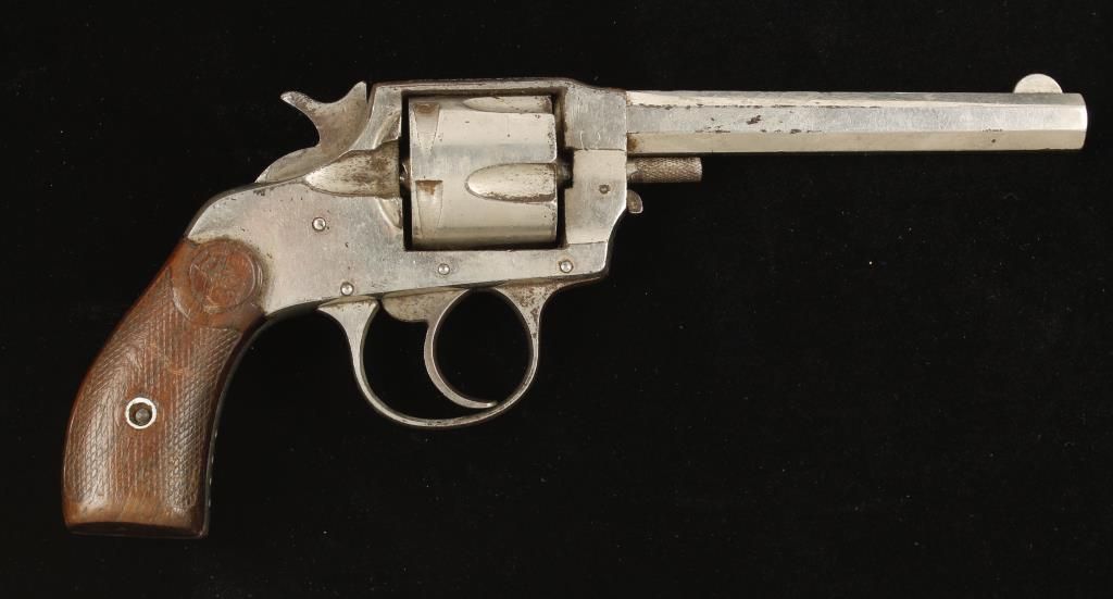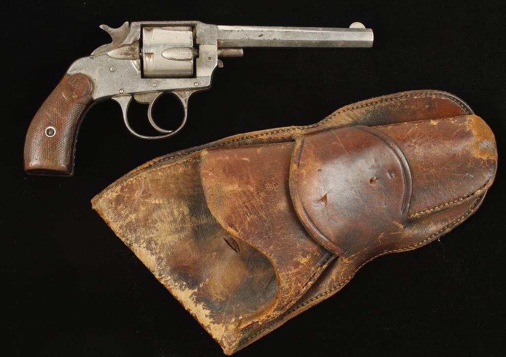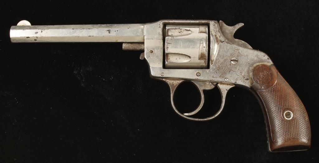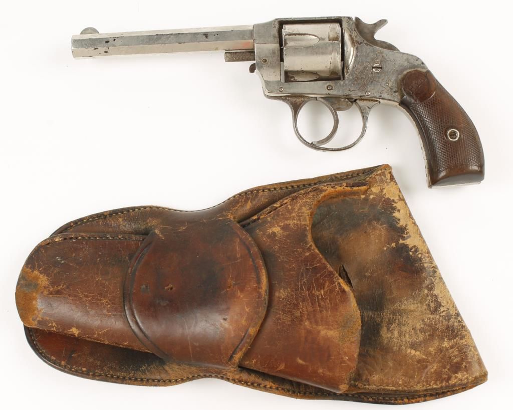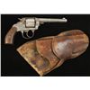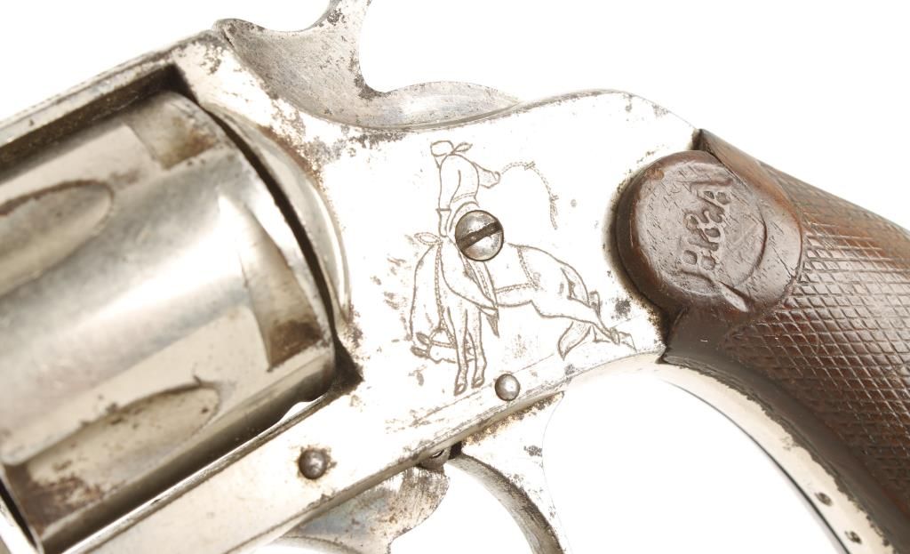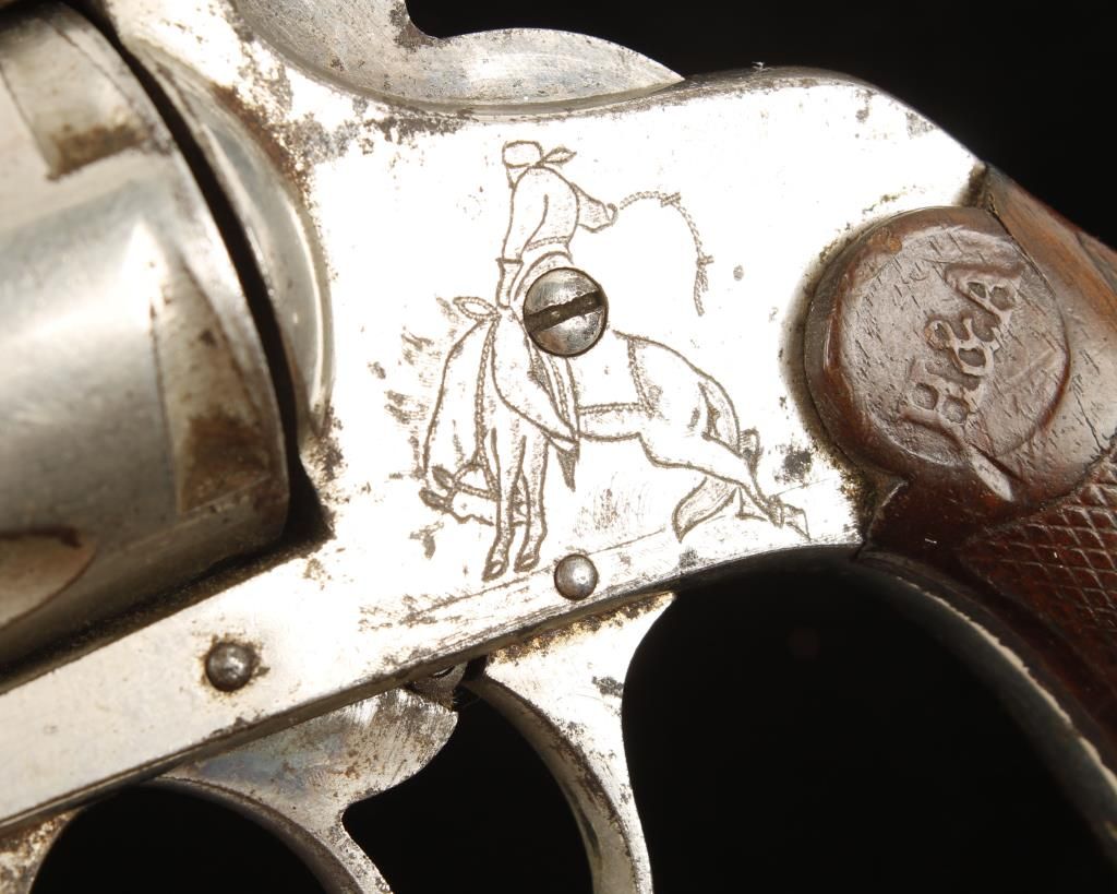 Double action 5 shot revolver with 4-1/2" barrel. Nickel finish, checkered wood grips and grooved receiver rear sight. Side of frame engraved with Bronc rider. Found in Tucson barber shop in 1950s with note that read " Ken Maynard used in Wild West Shows with Booger Red and given to Jimmy Johnson In 1940". Note not included as it was lost. Includes single loop leather holster. Condition: Fair to good with 90% original finish and good working action.
