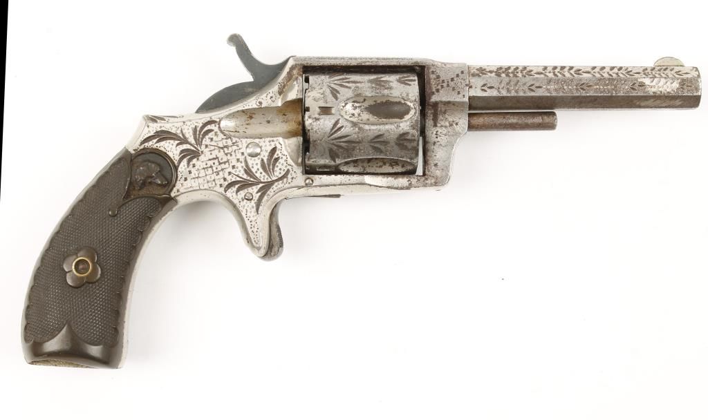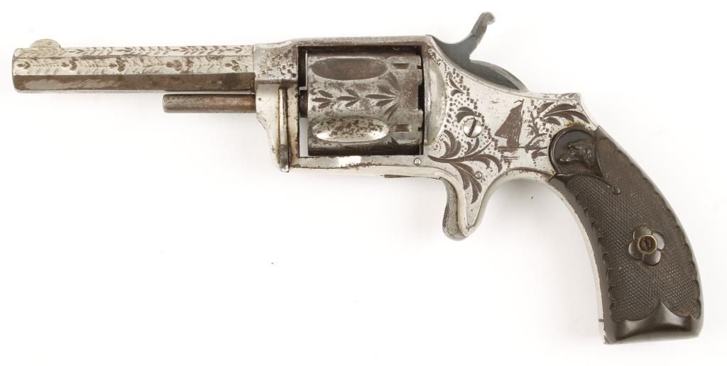 Early single action spur trigger 5 shot revolver with 3-1/4" octagon barrel. Nickel finish with engraving and checkered plastic dog head grips. Merwin & Hulbert design, frontier era. Condition: Fair to good with nickel flaking near muzzle and action works.