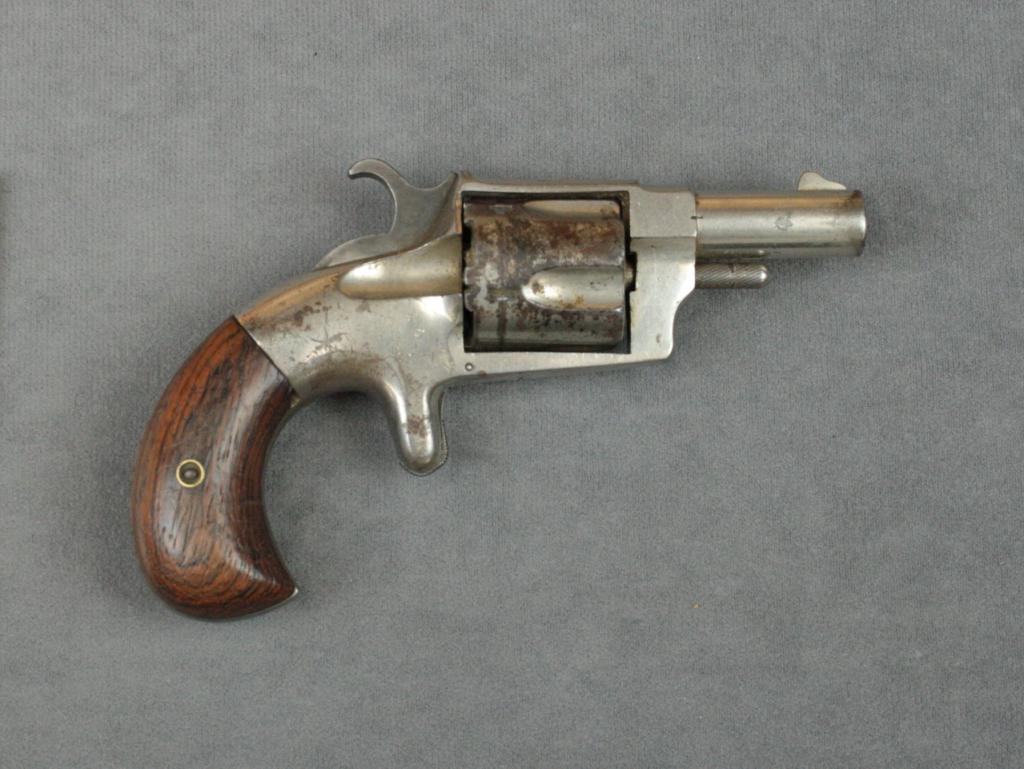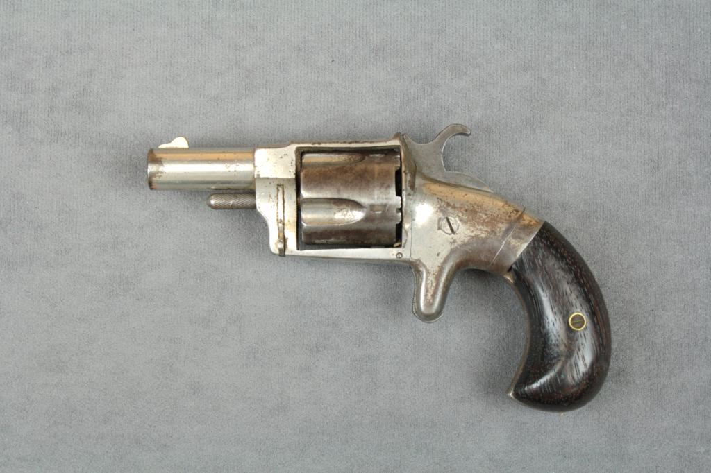 Hopkins & Allen Model No. 4 spur trigger revolver, .38 cal., 2” round barrel, nickel finish, wood grips, #1982. This gun is in overall good + condition showing approx. 40% original nickel finish, dark bore, actionneeds work, good markings and grips. Est.: $150-$300.