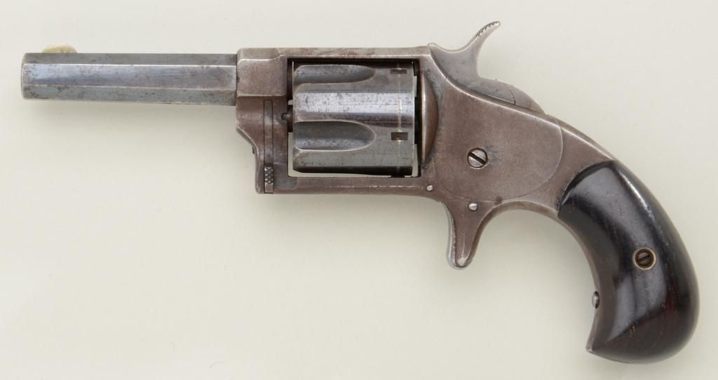 Hopkins & Allen No. 3 N.Y. spur trigger revolver, .30 cal., 2-3/4” octagon barrel, blue finish, wood grips, #832. This gun is in overall good to very good condition showing considerable original blue on barrel andcylinder with frame gone to a grey patina with some scattered erosion and pin prick pitting at firing areas; good bore, action and markings, very good grips; missing cylinder pin. Est.: $150-$300.