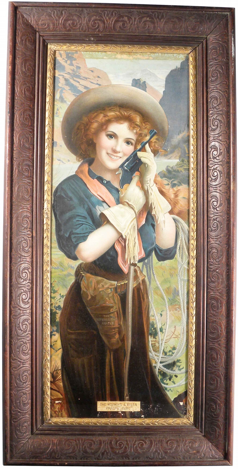 Hopkins & Allen Prairie Girl Paper Sign. Framed under glass. Tape residue at top and some minor paper loss at bottom edge. Good condition. 11 X 27 1/2 inches image only.