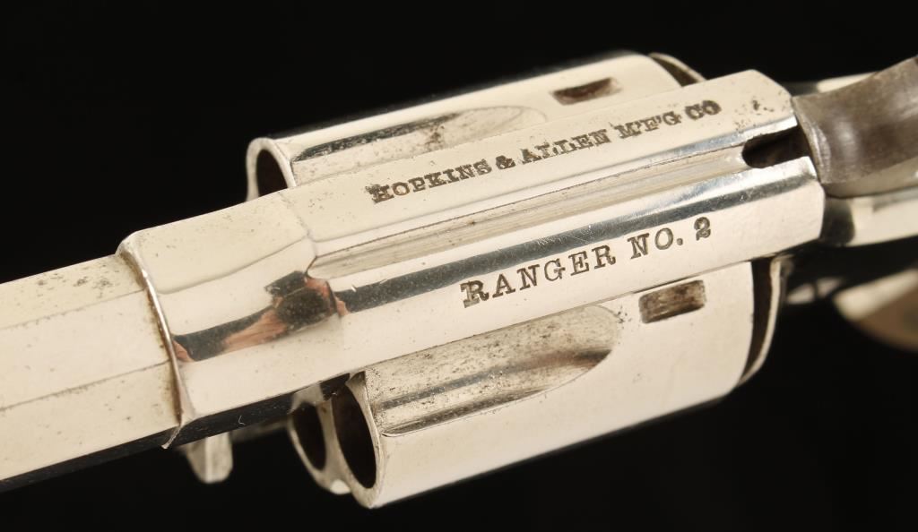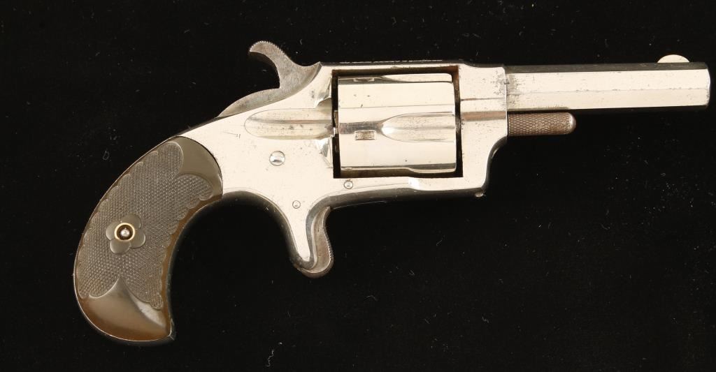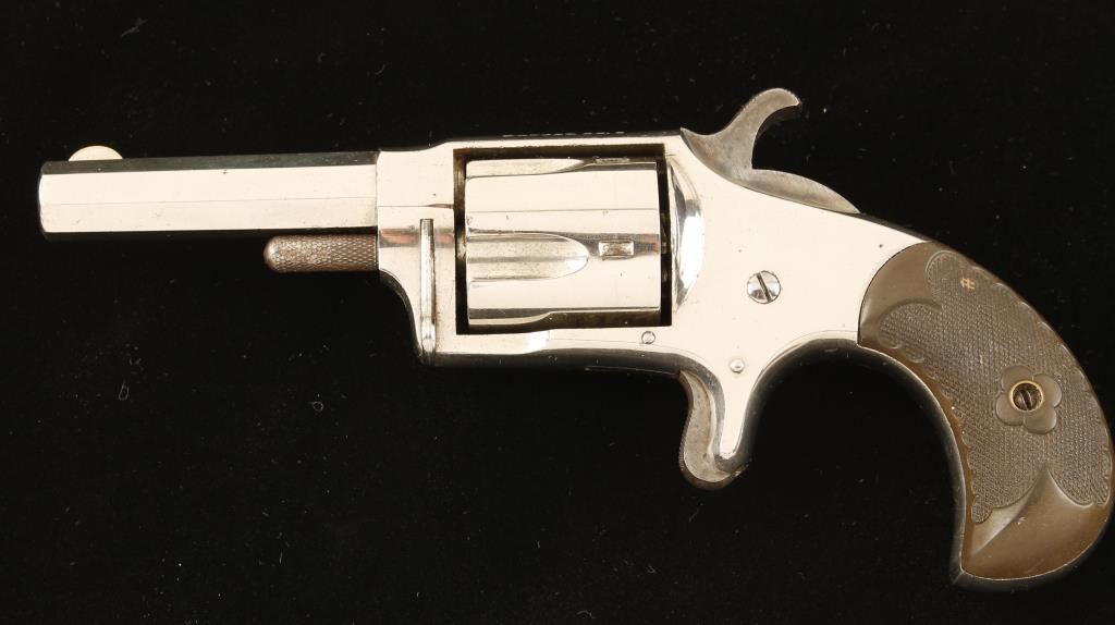Nickel plated single-action spur-triggered 5-shot revolver with a 2-3/4" octagon barrel and bird's head grip. The plating is shiny and with approximately 95% remaining. The bore has patches of corrosion but there is strong rifling. The chambers have a few spots of discoloration. The hard rubber grips are in excellent condition. Functions well. Condition is excellent. *Antique Firearm*