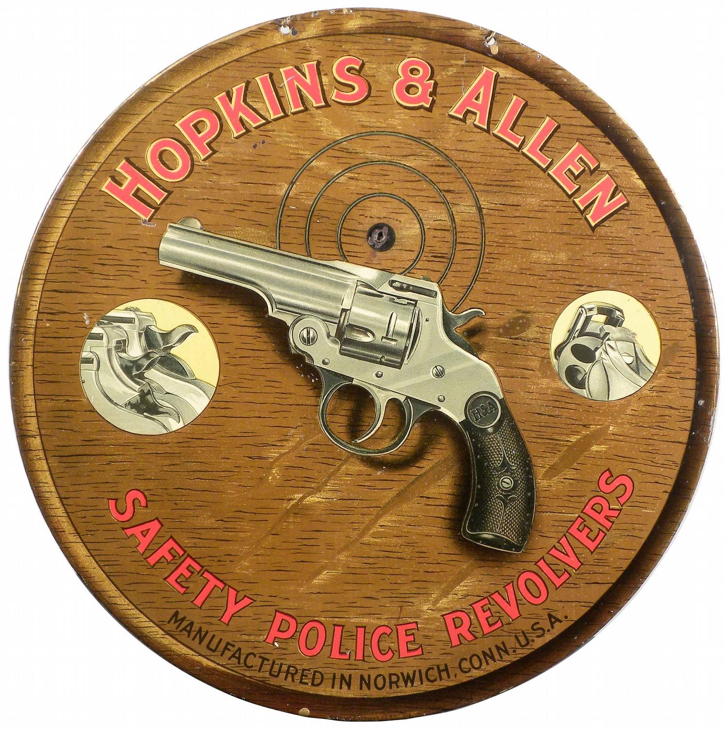 Extremely Rare Hopkins & Allen Safety Police Revolvers Die Cut Tin Sign. Chain hanging. Manufactured in Norwich, Conn. USA. A couple of small surface rubs otherwise excellent condition. 11 1/4 inch diameter.