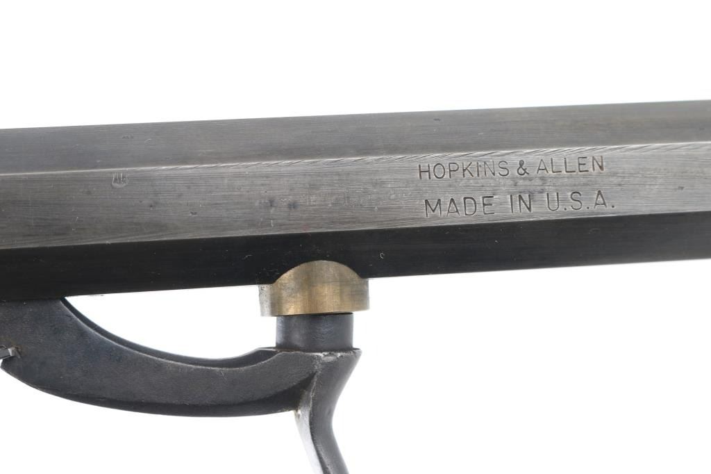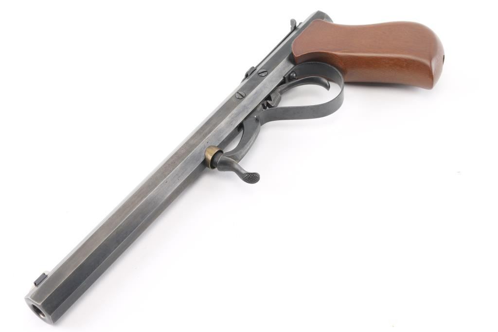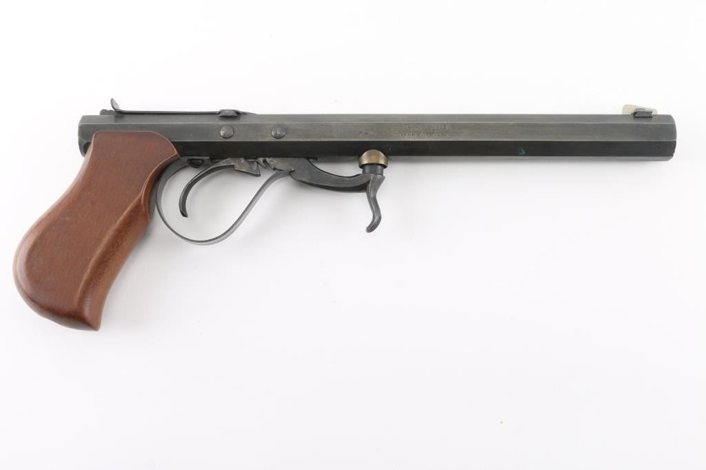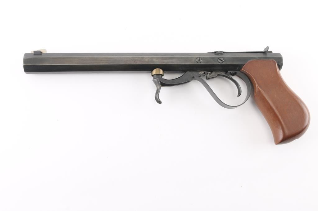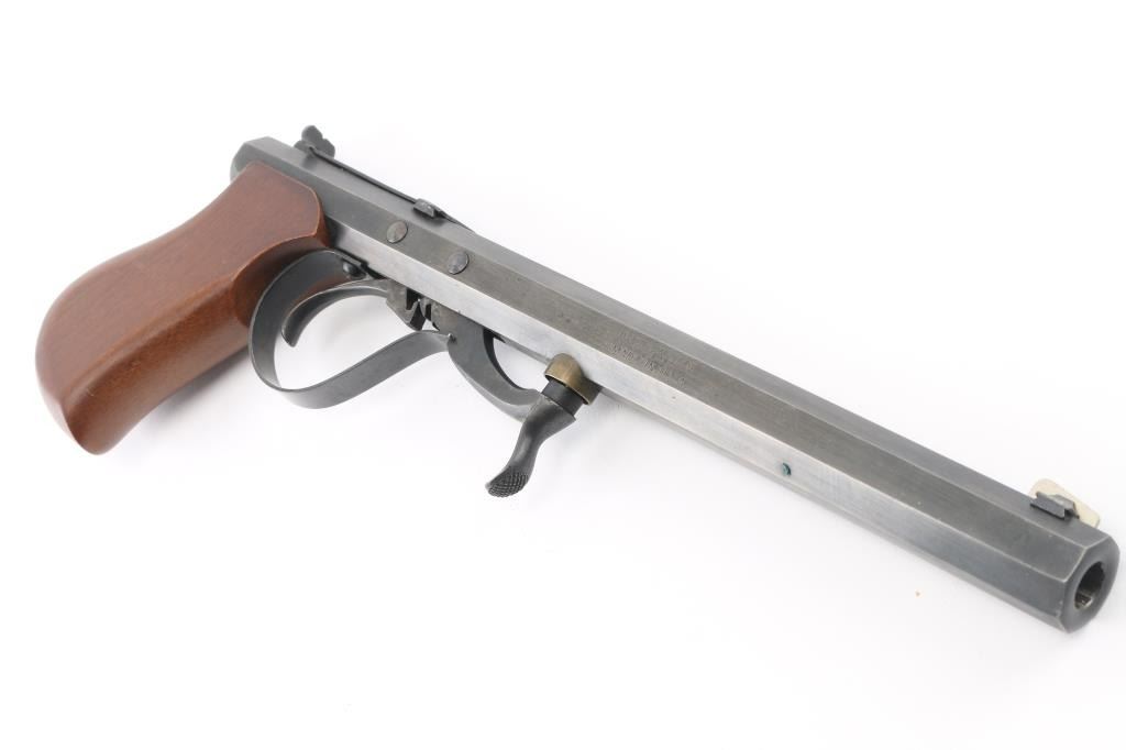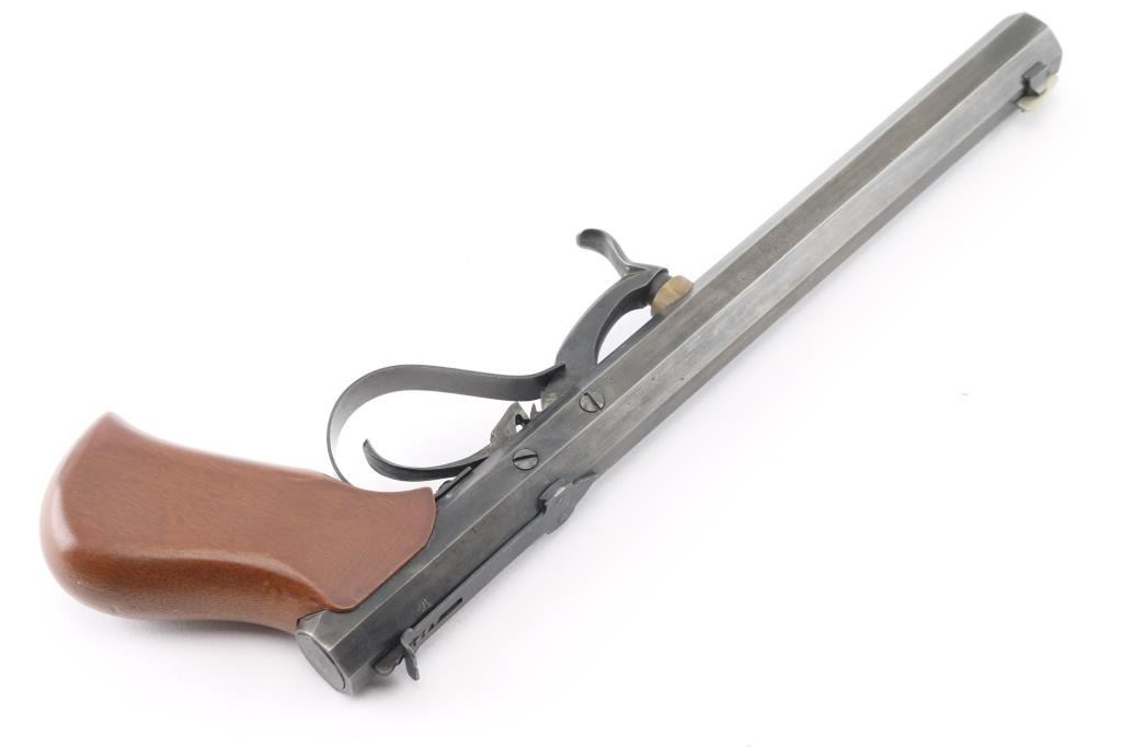 45 caliber, SN: 0166, percussion pistol for black powder or Pyrodex only. Features 6.5" octagon barrel (12.5" overall length), blade front & sporting rear sights, smooth wood grip. Possibly assembled from a kit, finish appears to be cold blued, with mottled gray coloration. Wood grip is very good. Bore is pristine, appears unfired. Condition is NRA Very Good++ *** 'Antique' Firearm ***