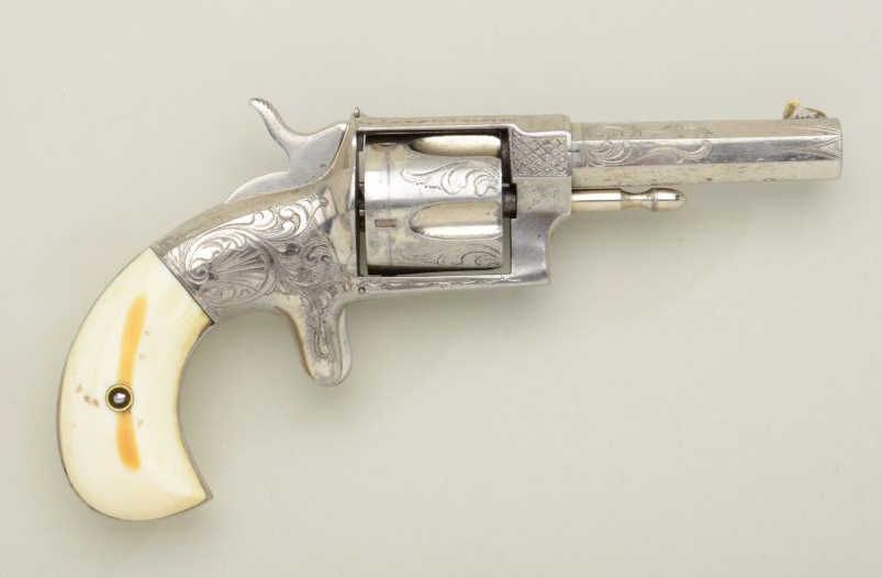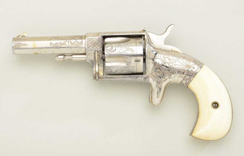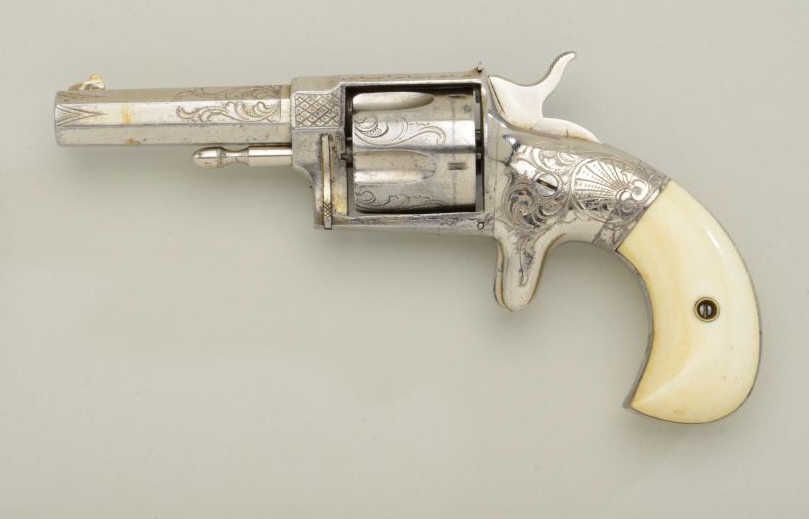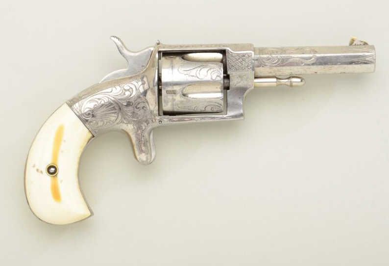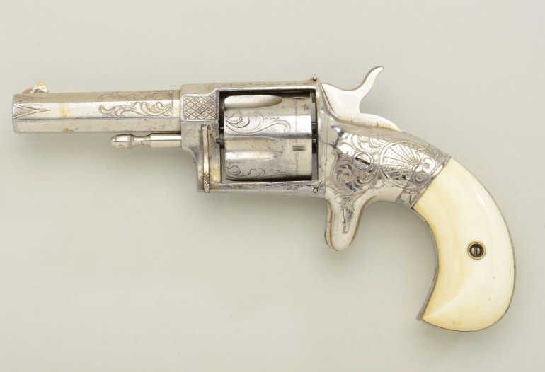 Hopkins & Allen X.L. No 4 NY, patented 1871, .38 cal. rimfire, 5-shot, nicely New York scroll engraved, nickel plated, ivory grips, serial #373A on bottom of barrel. The revolver retains 75-85% original nickel, some light cleaning and dried oil, generally crisp with good markings, good grips showing slight yellowing. The action good, bore good, markings sharp. The engraving is good quality. Est.: $600-$1,200