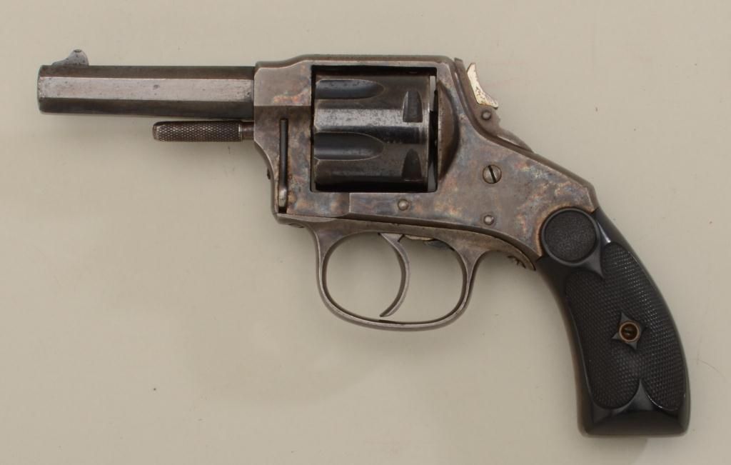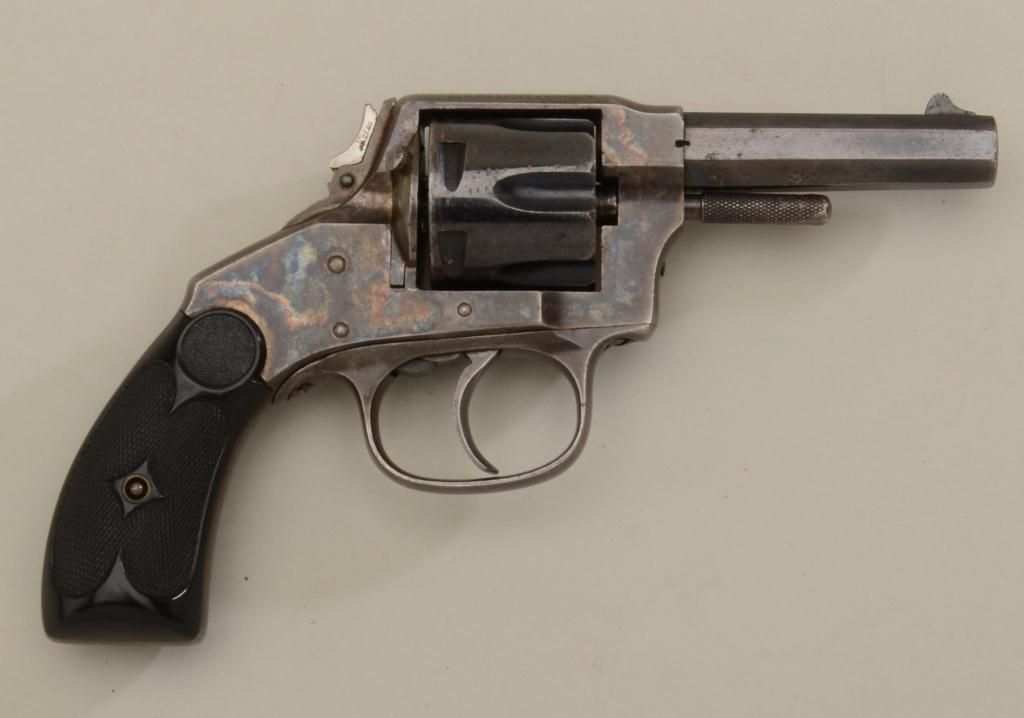 Hopkins & Allen XL DA revolver, .32 cal., 3” octagon barrel, blue and case hardened finish, checkered black hard rubber grips, folding hammer, #6974. This gun is in overall very good to fine condition showing themajority of its original blue finish on barrel and cylinder and the majority of its original muted case colors on the receiver, good action and bore, very good to fine grips. Est.: $200-$400.