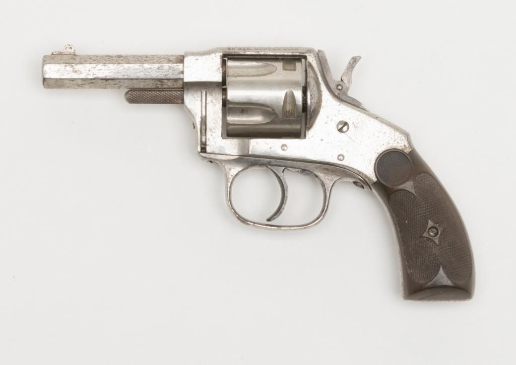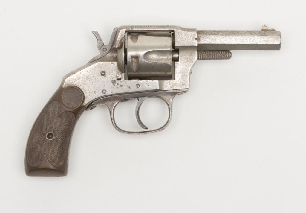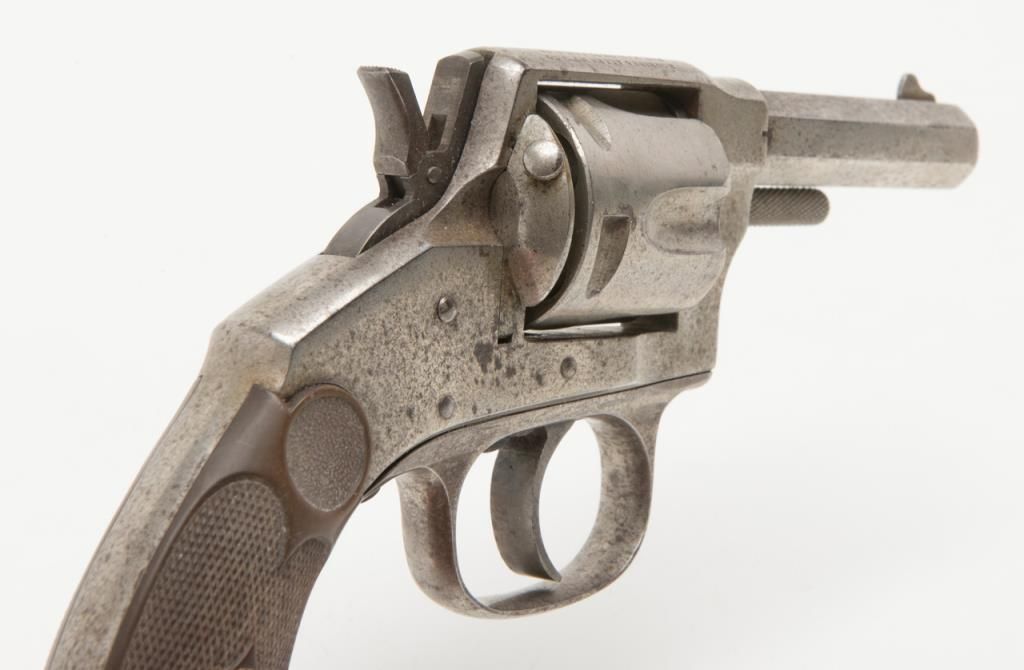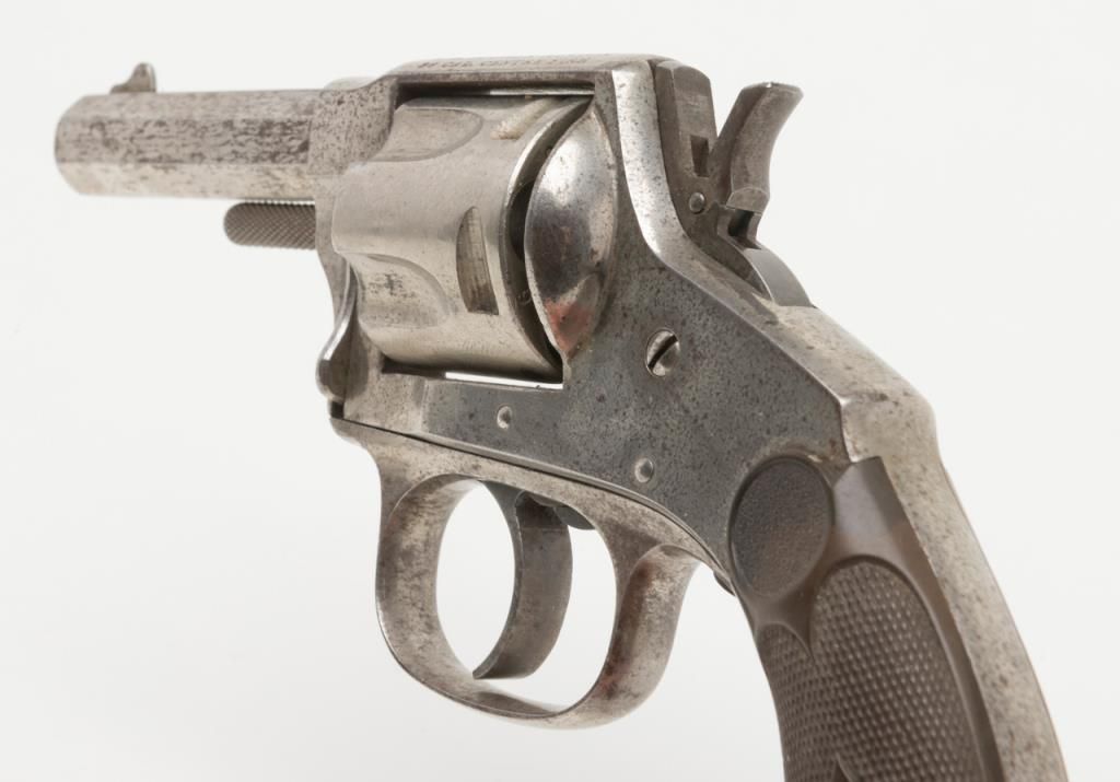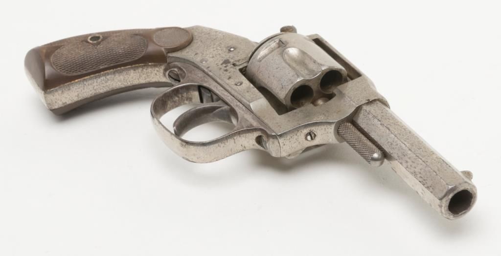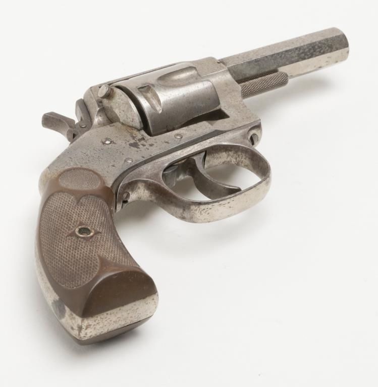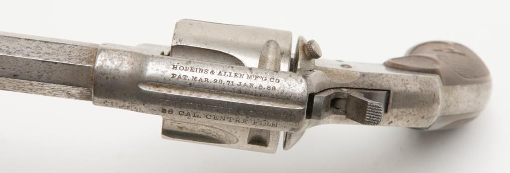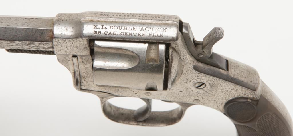 Hopkins & Allen XL Double Action revolver, .38 cal., 3” octagon barrel, nickel finish, checkered hard rubber grips, folding hammer, #7090 in overall very good condition showing considerable original finish, good bore, action, markings andgrips with a hairline crack on the bottom of the left grip. (Antique). Est.: $50-$100.