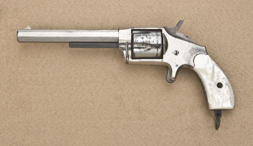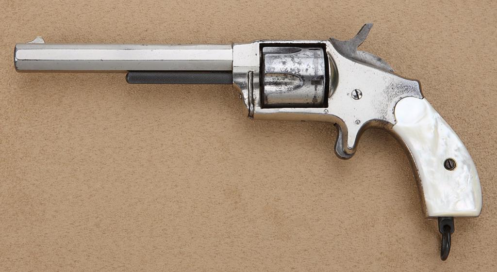 Hopkins & Allen XL No. 5 Model spur trigger revolver, .38 cal., desirable 5” octagon barrel, nickel finish, pearl grips, lanyard ring, #5720. This gun is in overall fine condition showing approx. 65% originalfinish, crisp action, sharp markings, dark bore, excellent iridescent pearl grips. Est.: $250-$500.